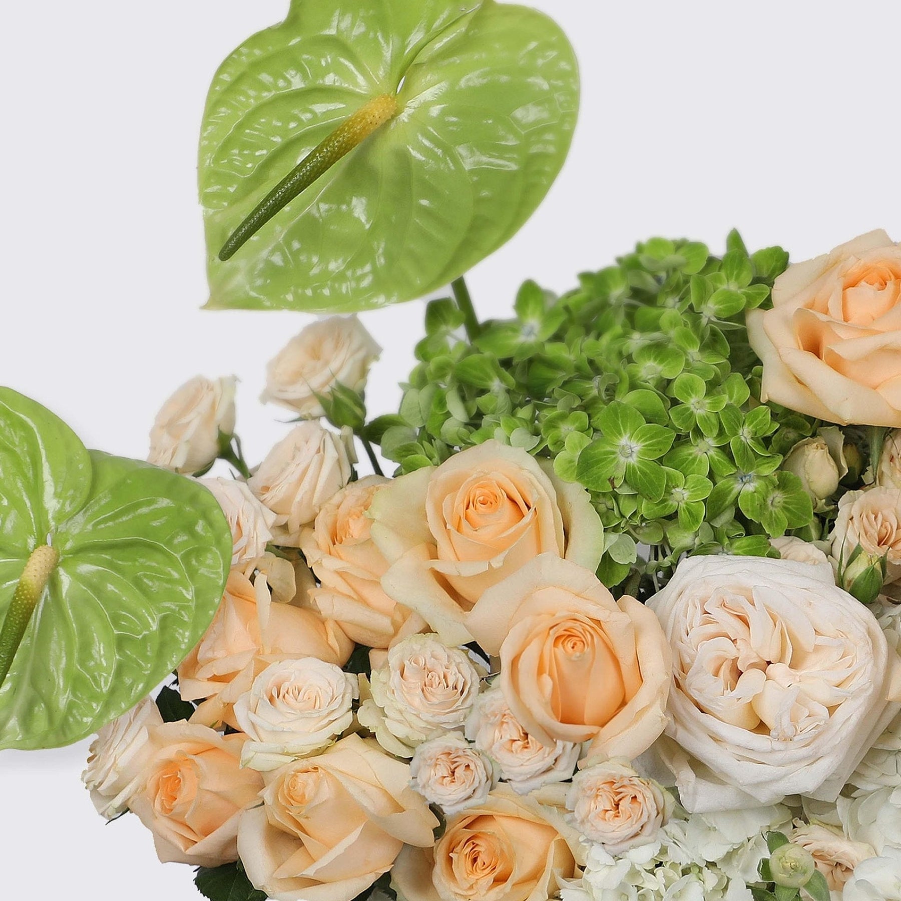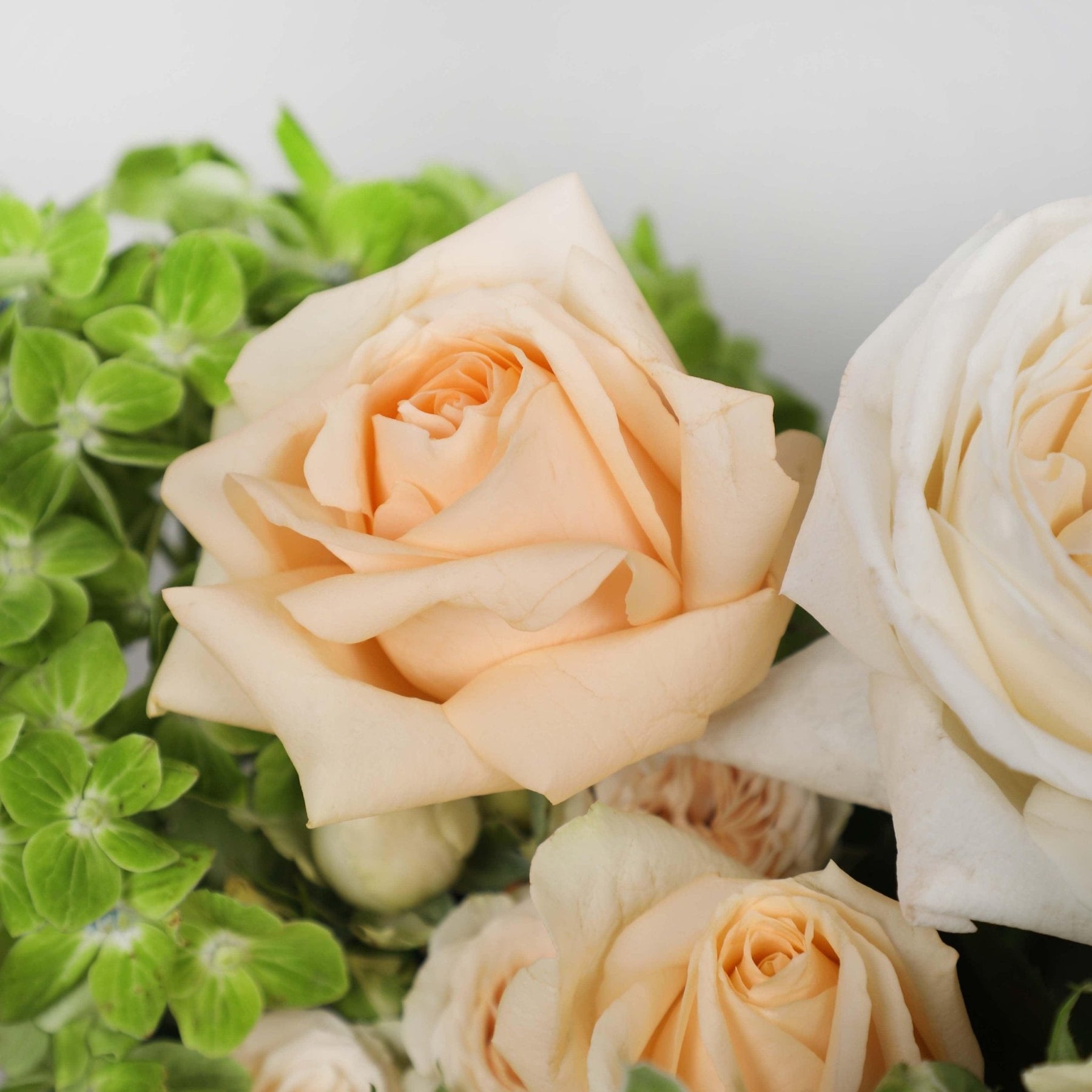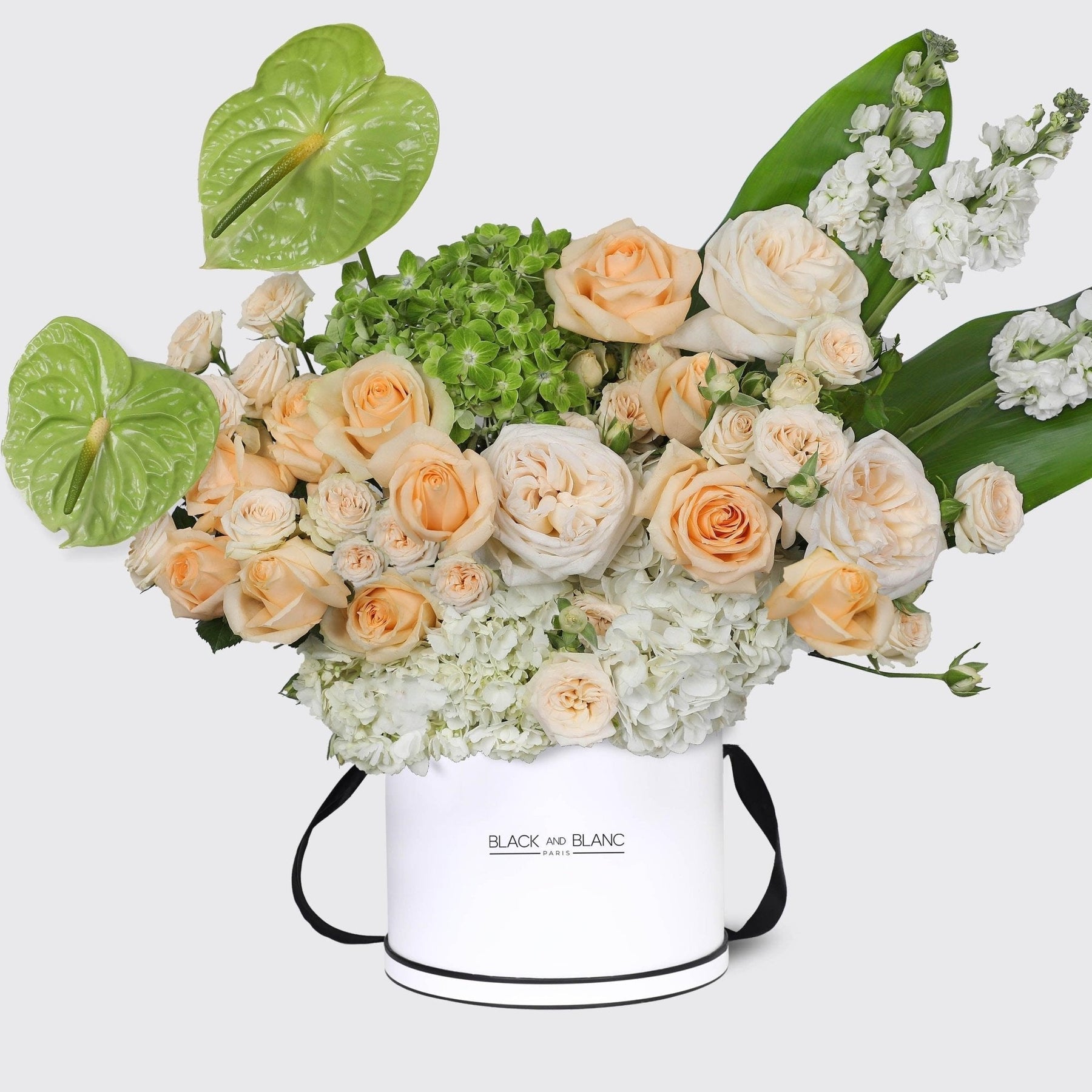 تنسيق صندوق أنيق يتميز بمزيج من الزهور البيضاء والخوخية والخضراء، مصمم لإضفاء النعمة والرقي.