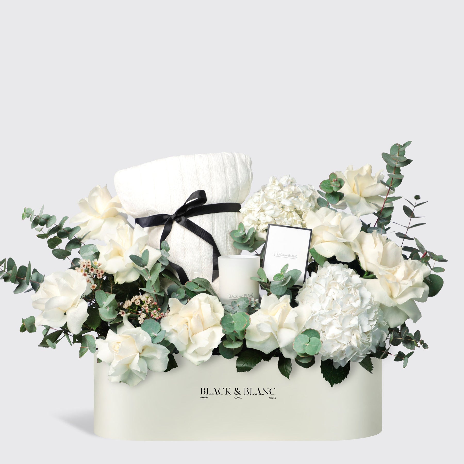 Experience pure indulgence with the Antoinette Hamper, including a cozy white blanket (100% Cotton, 180cm) scented candle, and enchanting mixed flowers. A luxurious treat awaits!
