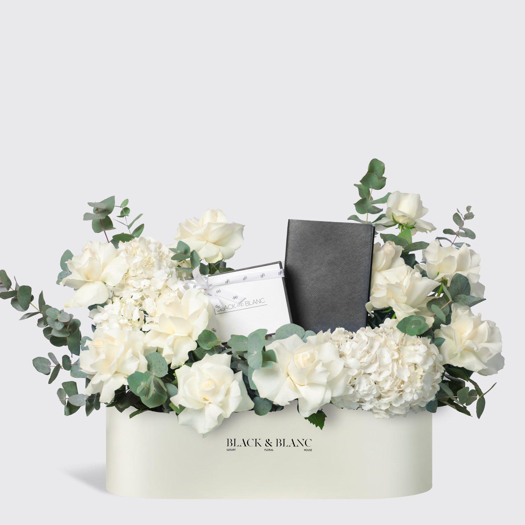 Indulge in the luxurious Fresh Antoinette hamper, complete with a Mont Blanc Notebook and 20 pieces of Truffles Chocolate. Adorned with white roses, hydrangeas, eucalyptus, wax flowers, and tranchelium, it's a sensory delight.