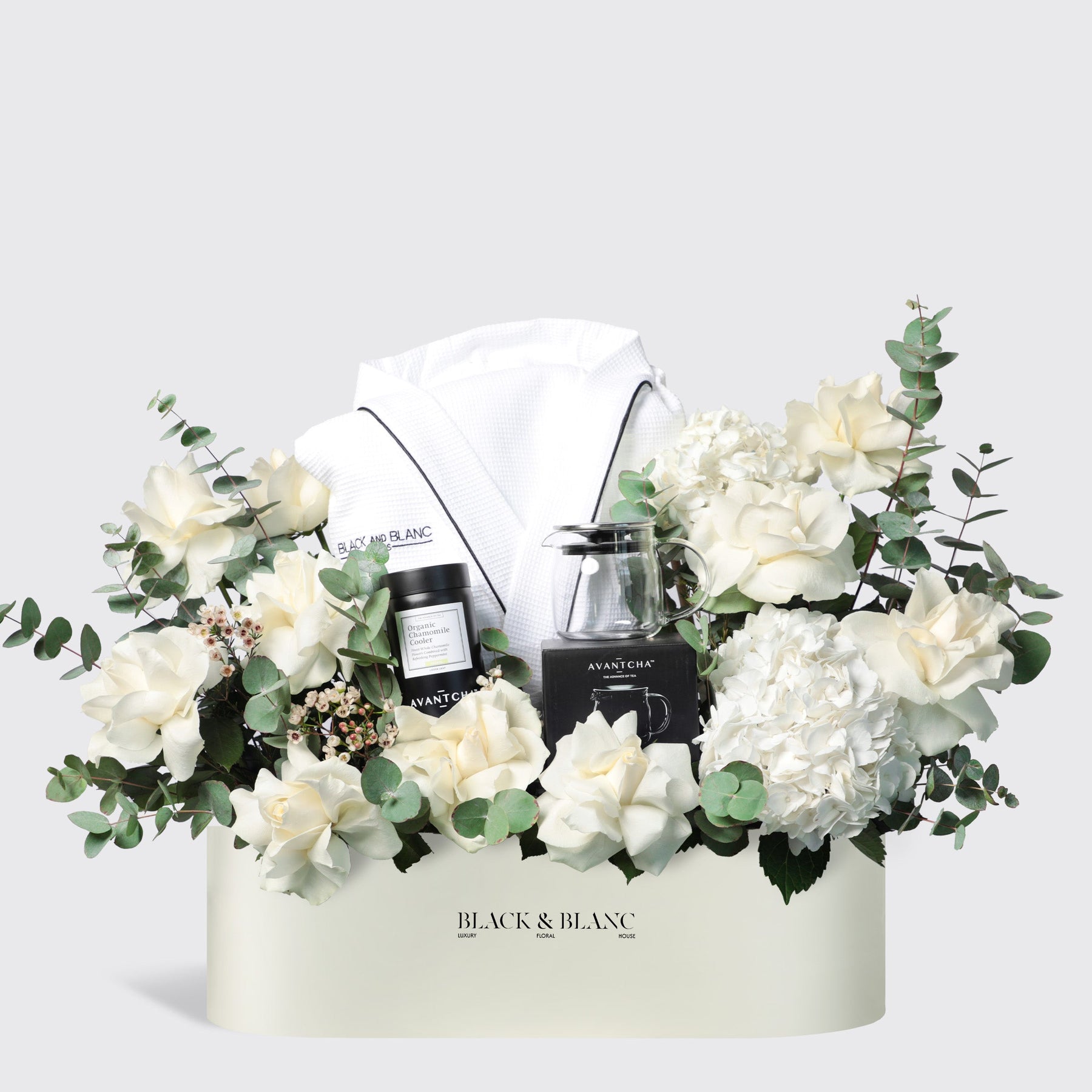 A luxurious gift set featuring an elegant Avantcha teapot with soothing chamomile tea, a cozy bathrobe, and a stunning floral arrangement of white roses, hydrangeas, eucalyptus, wax flowers, and trachelium. Perfect for pampering, relaxing moments, and thoughtful gifting, this ensemble blends comfort, elegance, and sophistication for any special occasion.