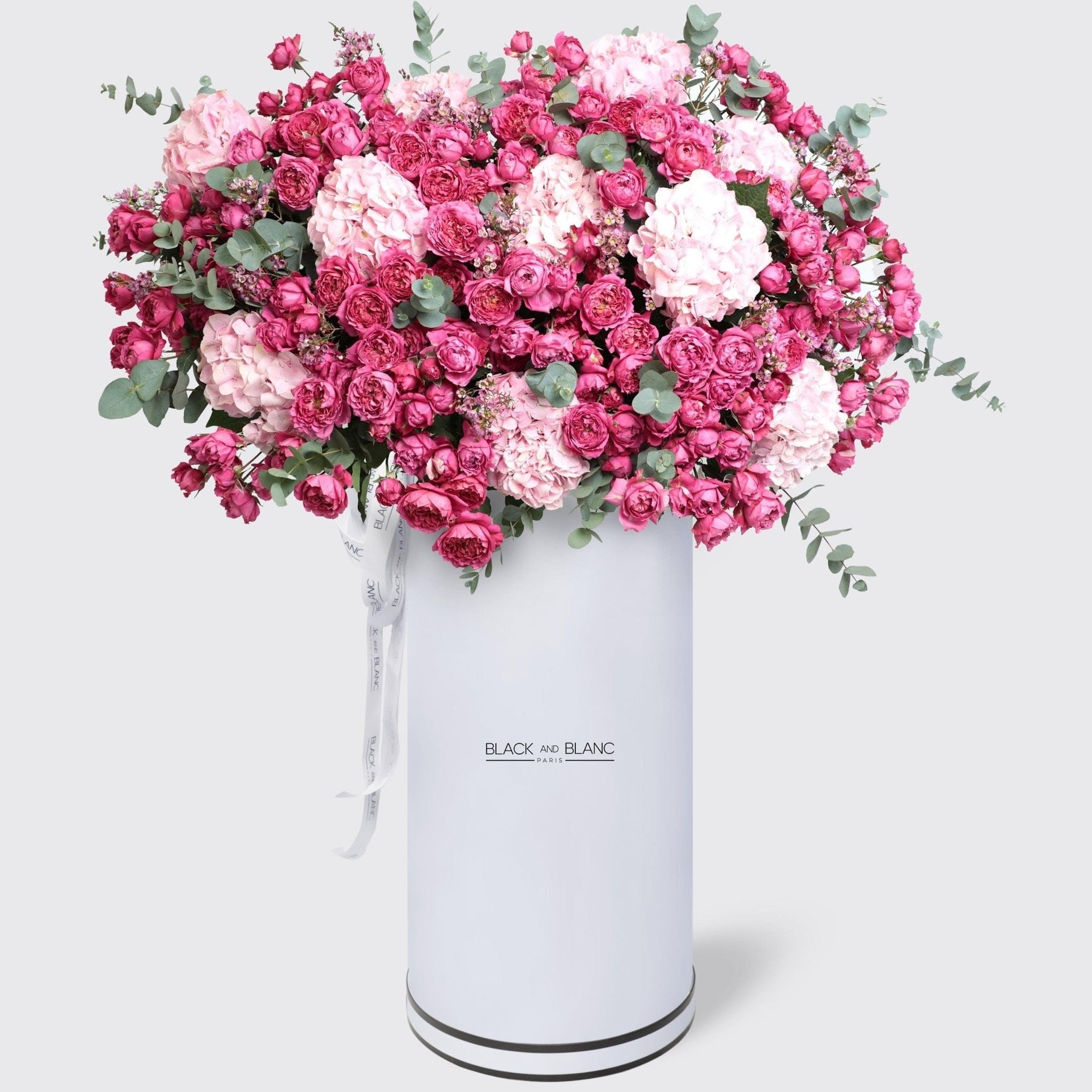 A lush blend of pink hydrangeas and Juliette spray roses. Elegant and impactful.