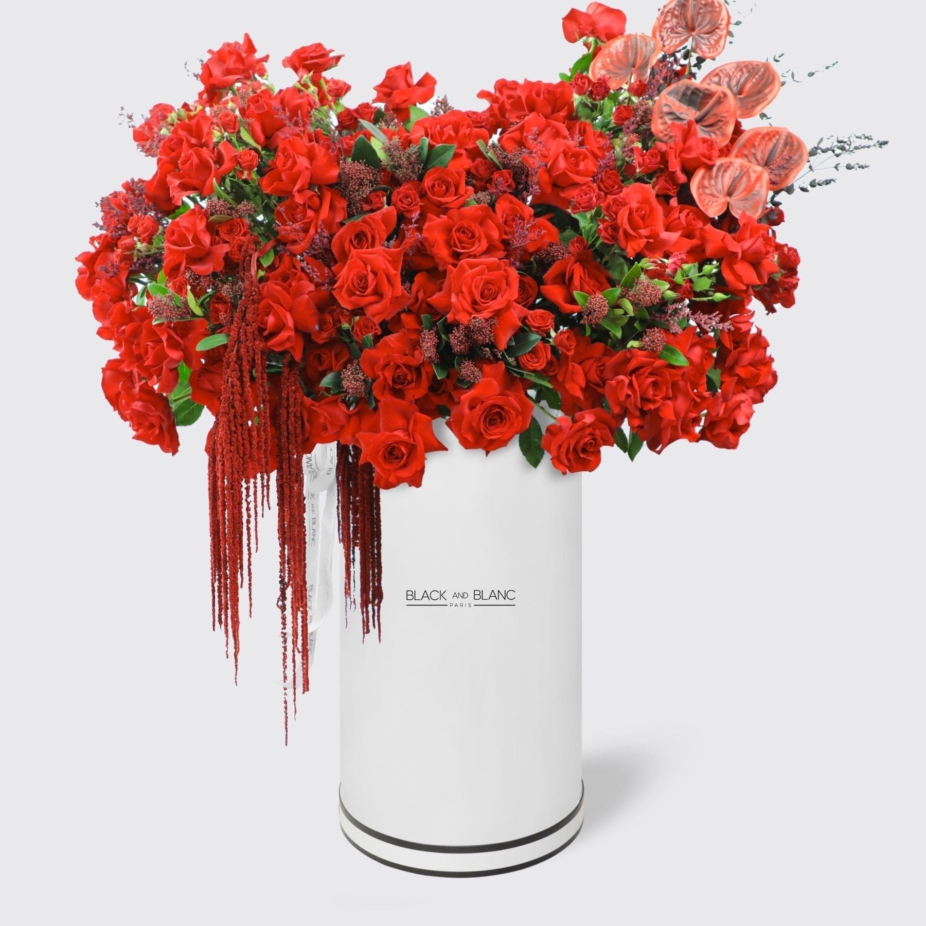 Expertly arranged in our signature BLACK AND BLANC box, Crimson Elegance features lush red roses intertwined with draping elements, creating a sense of movement and grandeur. This arrangement is designed to leave a lasting impression, whether for a romantic occasion, a celebration, or a luxurious gesture.