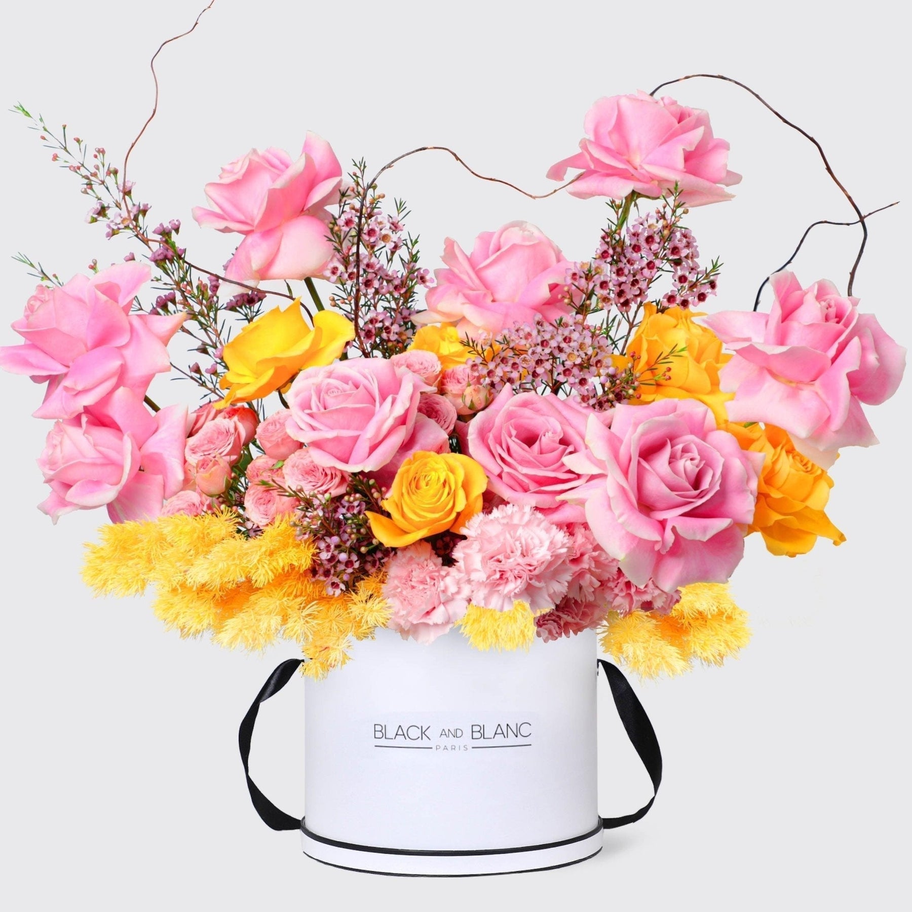 Discover the delightful blend of elegance and harmony with our Élégante Harmony Box, featuring a medley of pink roses, yellow roses, wax flowers, carnations, spray roses, salix sticks, and dried asparagus.