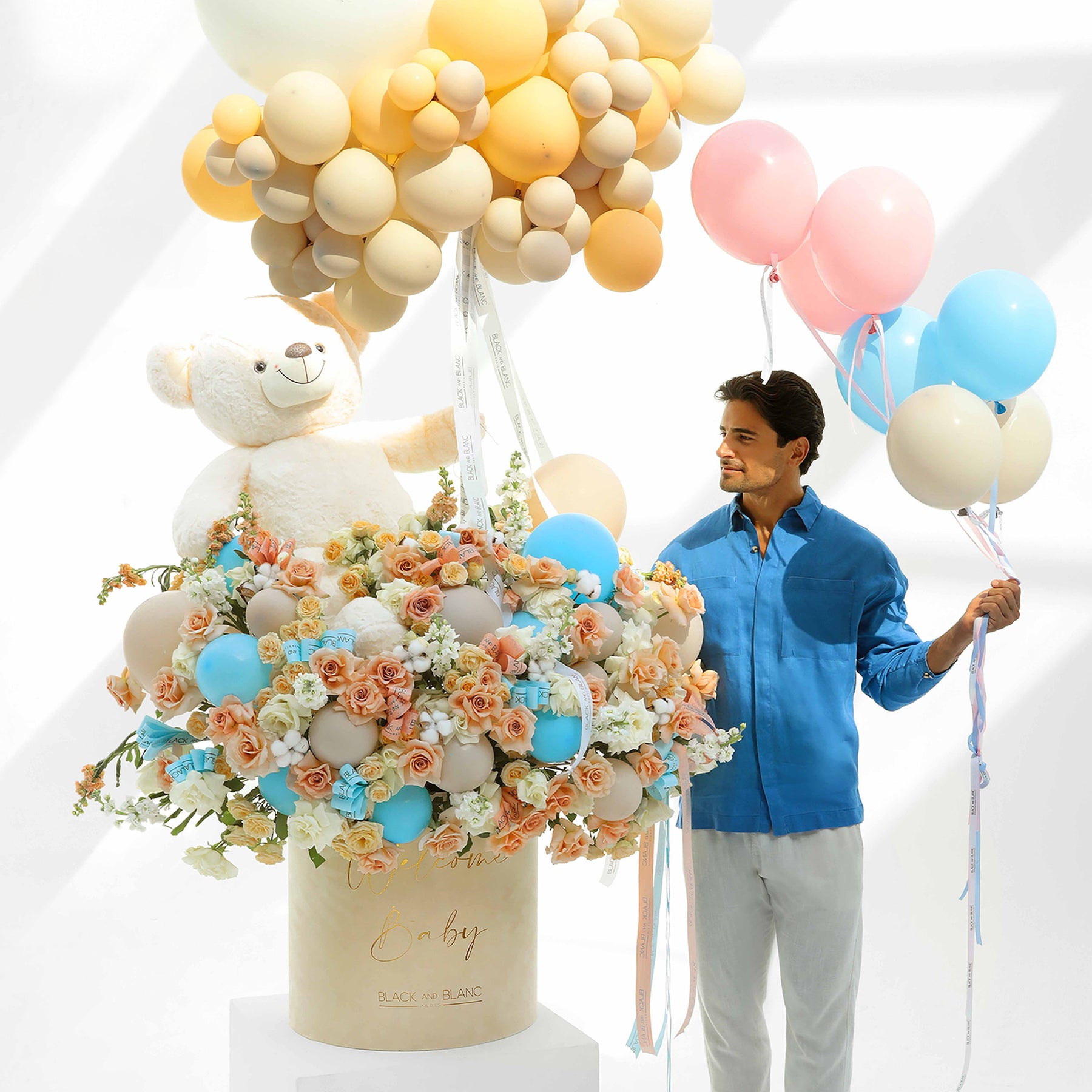 Surprise your loved one with the Golden Cuddle Bear gift set featuring mixed flowers including white hydrangea, white roses, Matthiola white, Quicksand roses, spray roses, Matthiola, and cotton, beautifully arranged in a 50x50cm box, complemented by a 90cm white teddy bear and assorted balloons in various colors and sizes.