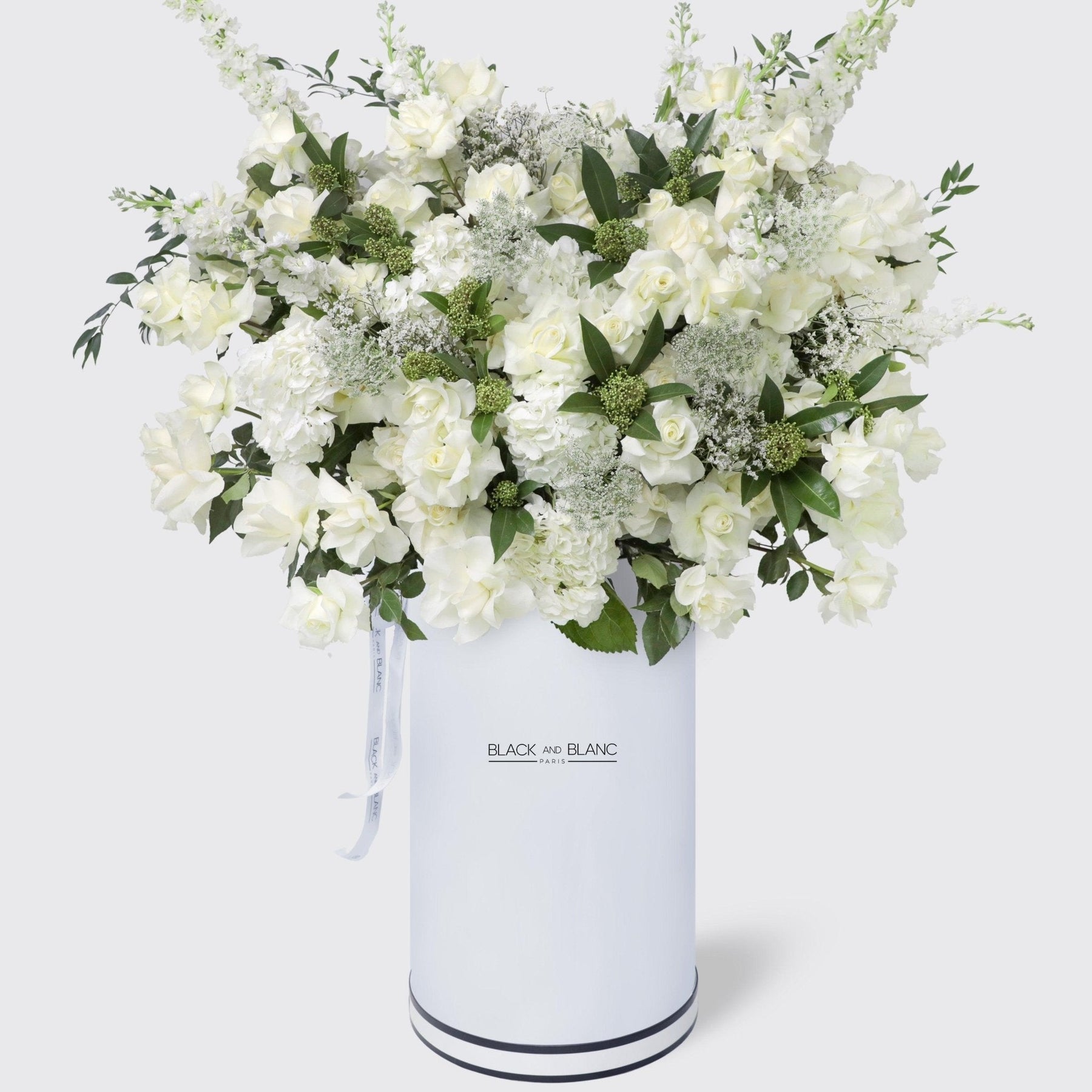 Jardin Blanc in Pinnacle Box is a breathtaking arrangement featuring Hydrangea White, White Roses, Delphinium, Matthiola White, Limonium, Skimmia, and Italian Ruscus, elegantly crafted with 140-150 stems.