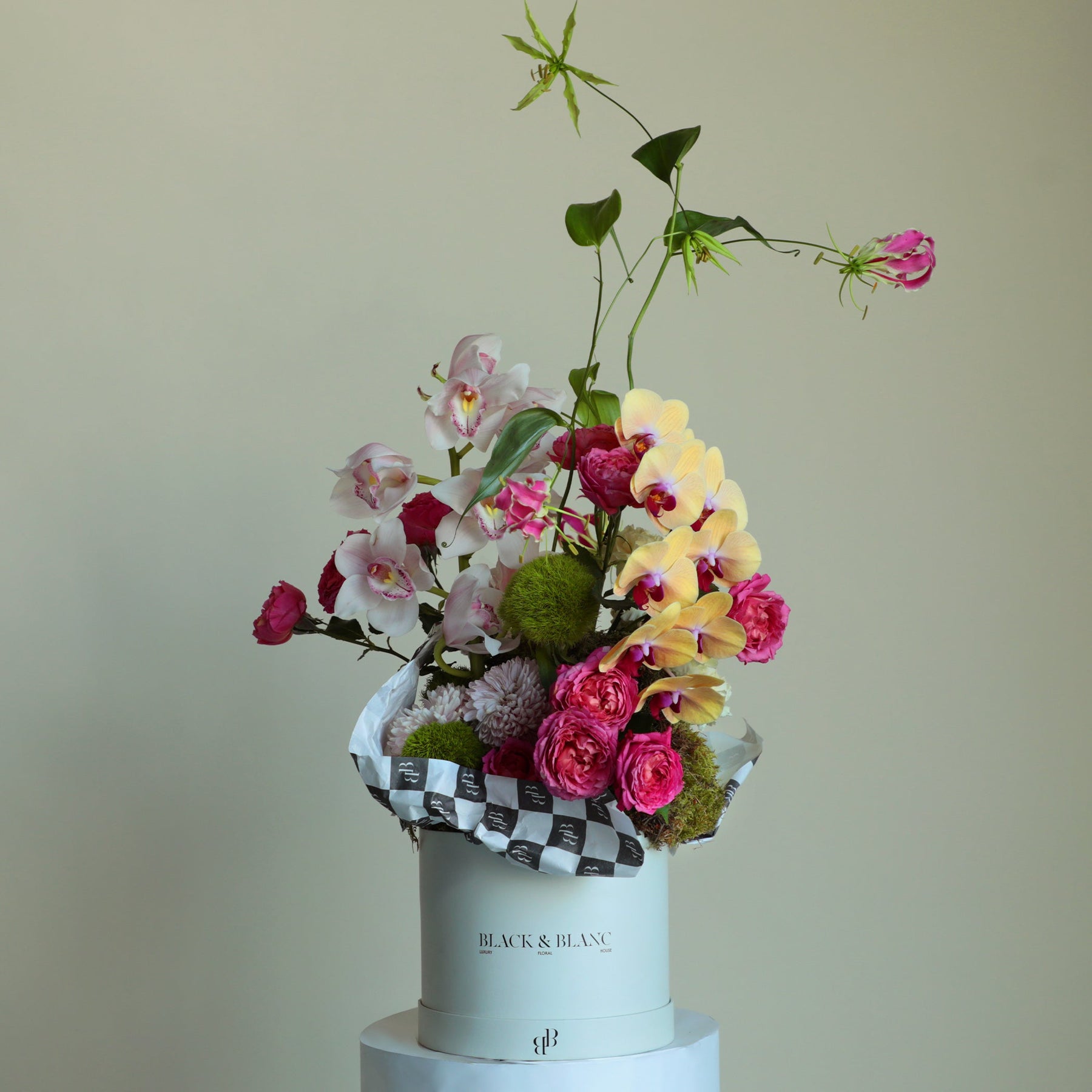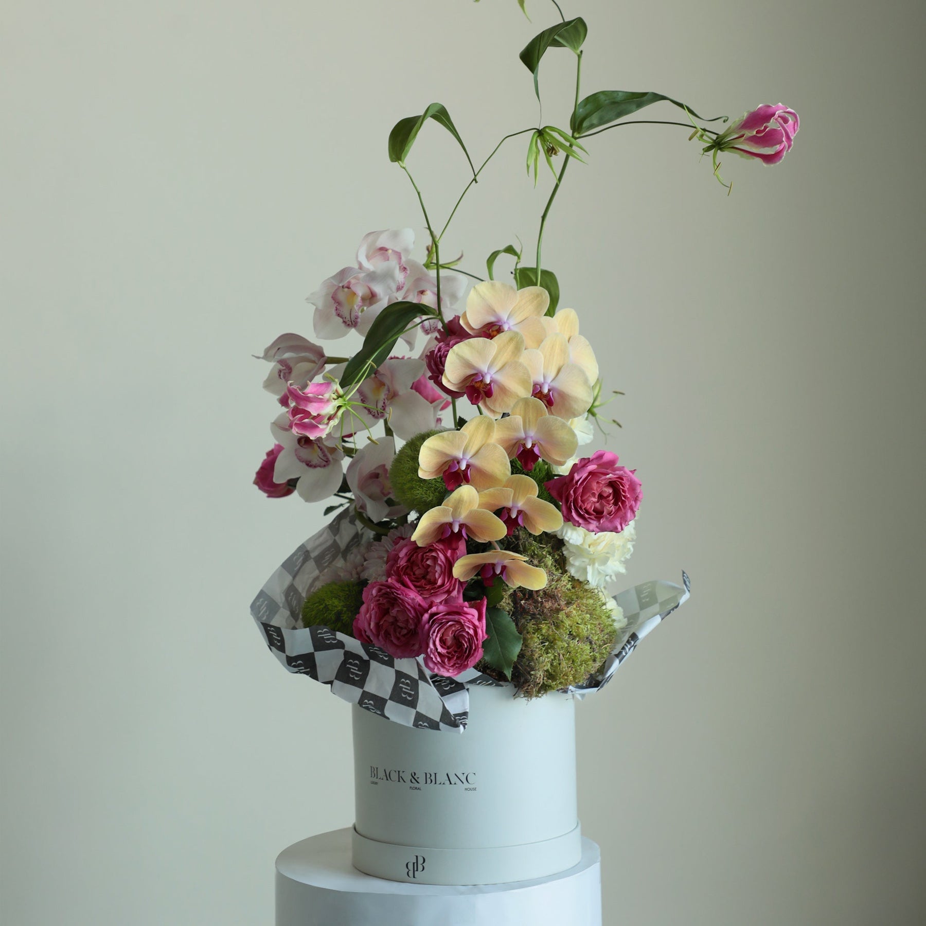 A whimsical composition of orchids, garden roses, gerberas, gloriosa, and heliconia, arranged in playful,