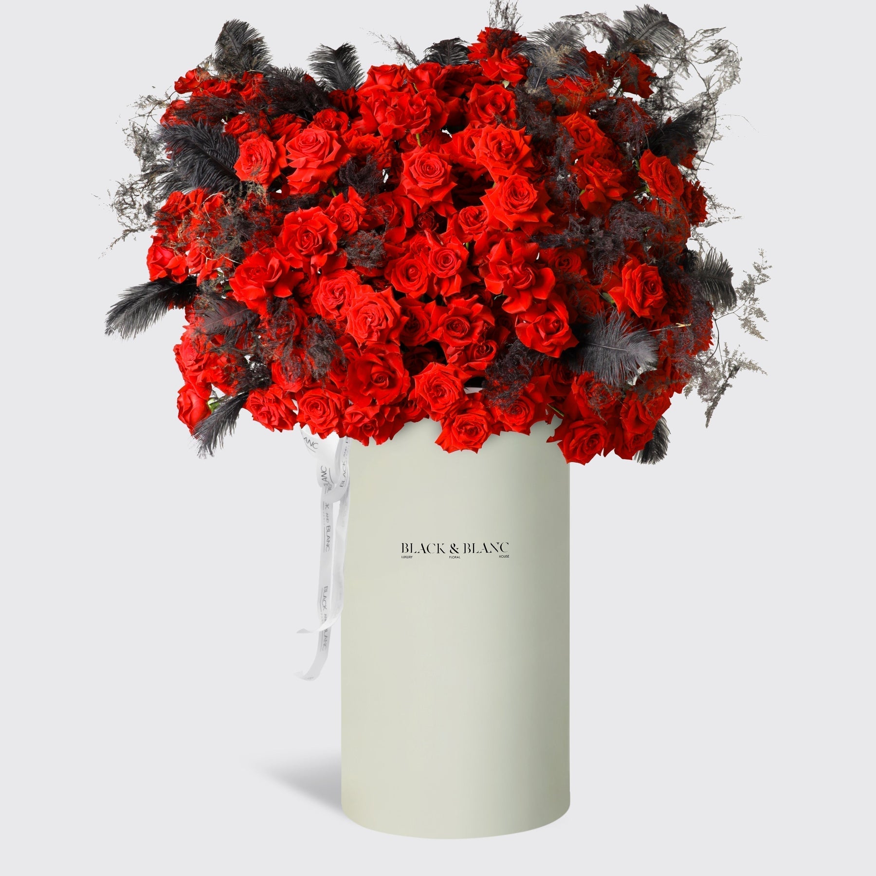Each arrangement is thoughtfully designed in our signature BLACK AND BLANC box, where the bold contrast of crimson roses and dark feathers creates a dramatic statement. A masterpiece of elegance, Midnight Passion is perfect for those who appreciate bold romance and timeless sophistication.