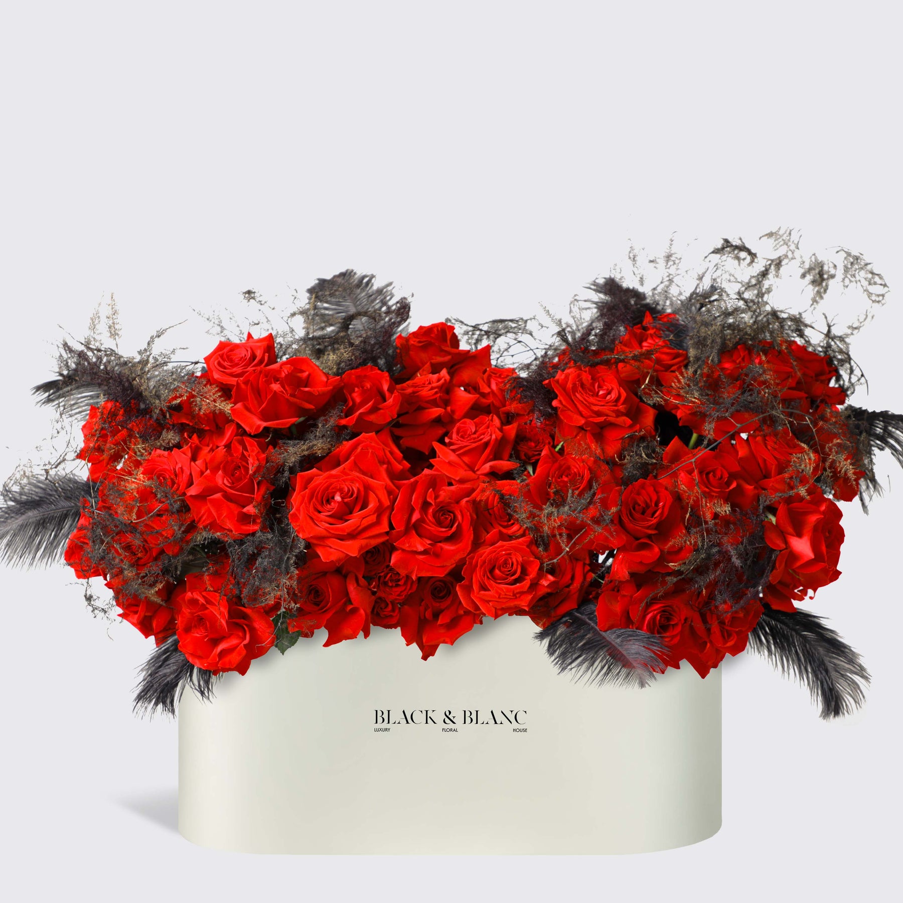 Each arrangement is thoughtfully designed in our signature BLACK AND BLANC box, where the bold contrast of crimson roses and dark feathers creates a dramatic statement. A masterpiece of elegance, Midnight Passion is perfect for those who appreciate bold romance and timeless sophistication.