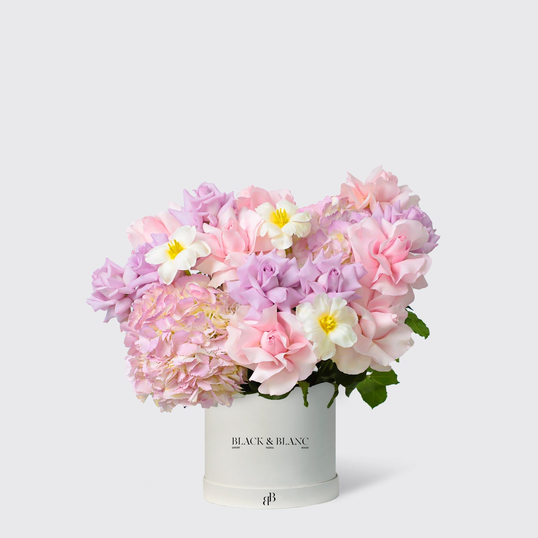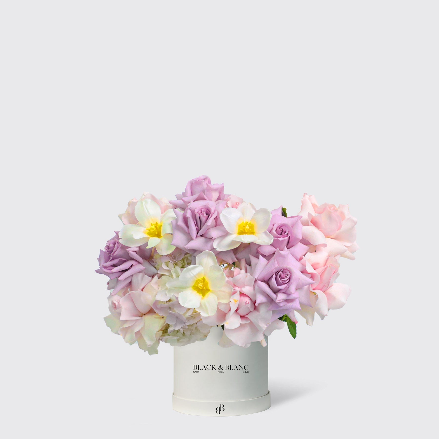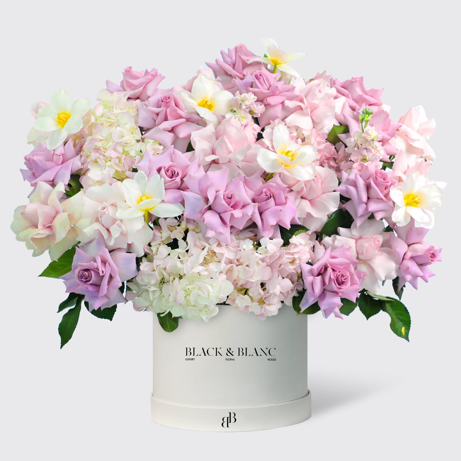 Purple Paradise in a Box features a stunning blend of light purple roses, white tulips, pink hydrangea, and pink roses. Elegantly arranged to create a vibrant and sophisticated display, this luxurious bouquet is perfect for birthdays, anniversaries, celebrations, or simply brightening someone’s day with timeless floral beauty. 💜🌸