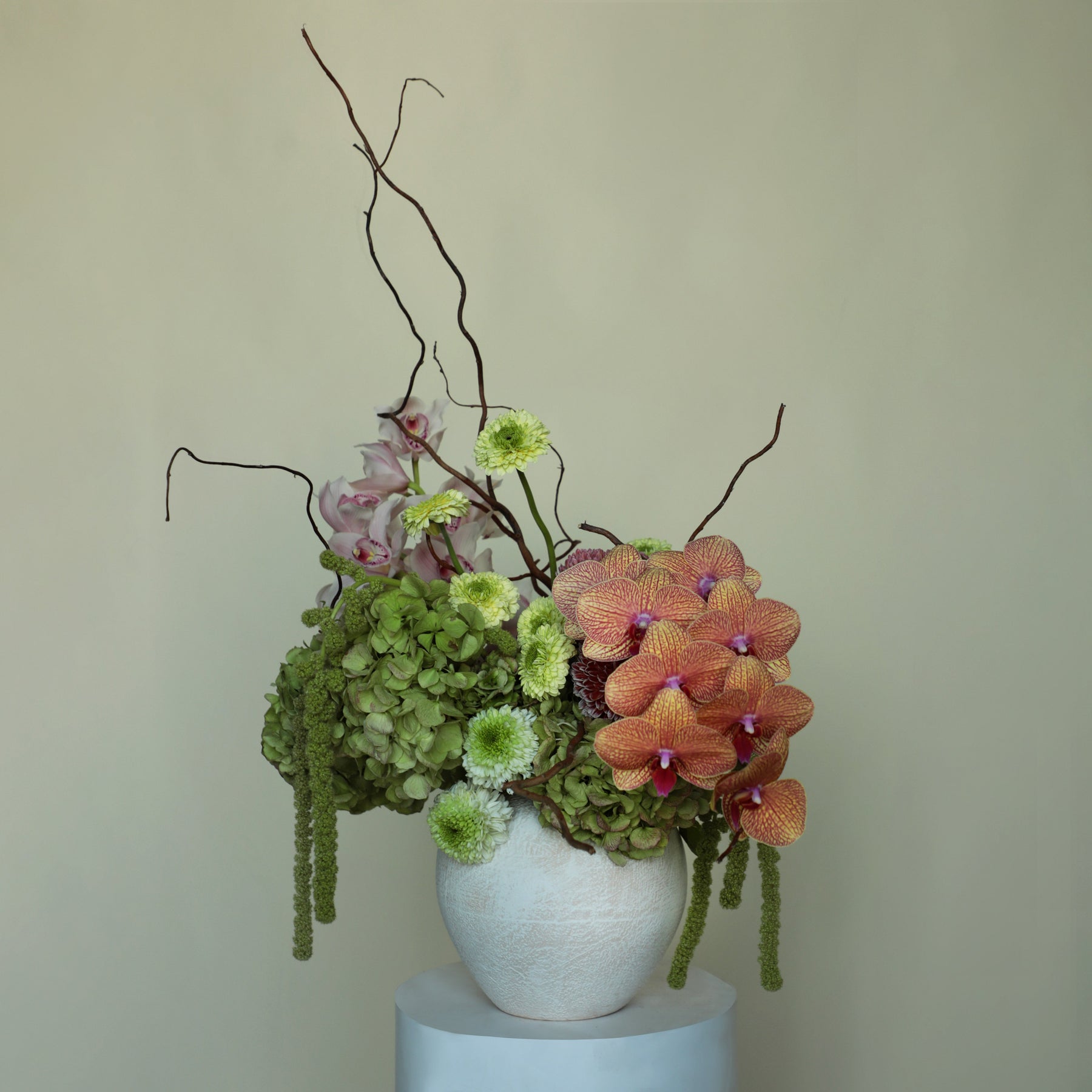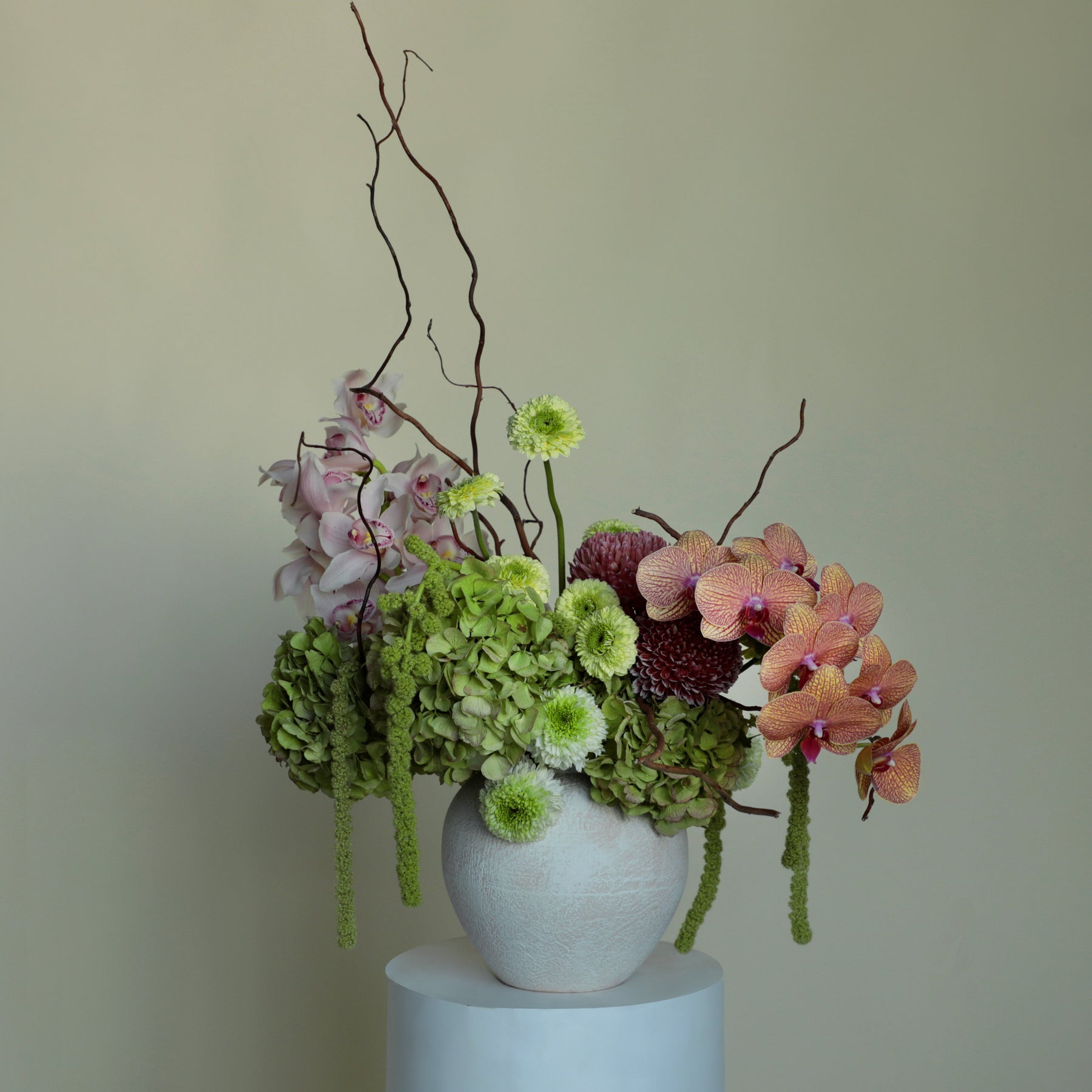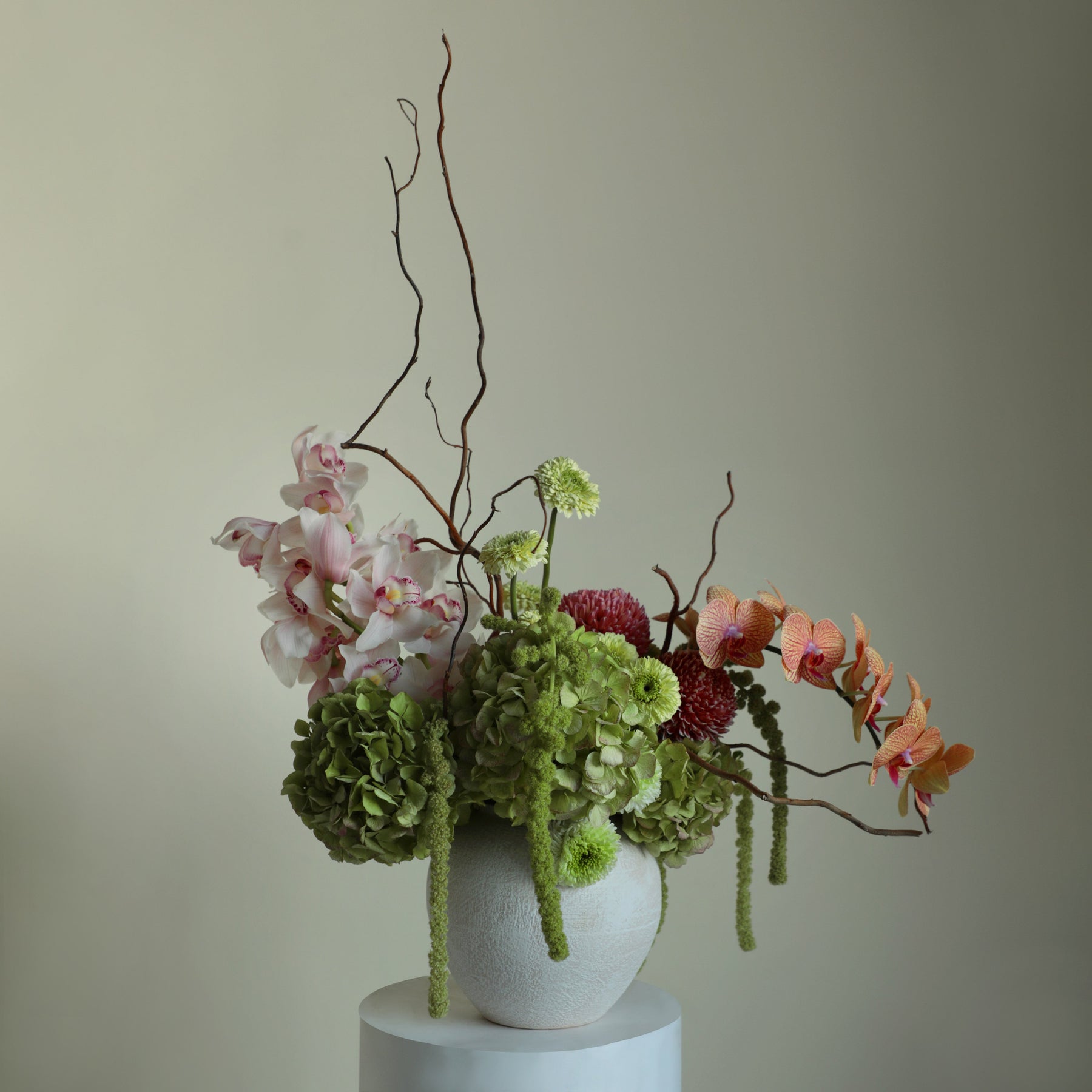 A gentle composition of green hydrangea, cymbidium orchids, phalaenopsis orchids, disbuds, and cascading amaranthus, shaped in soft, thoughtful movement.
