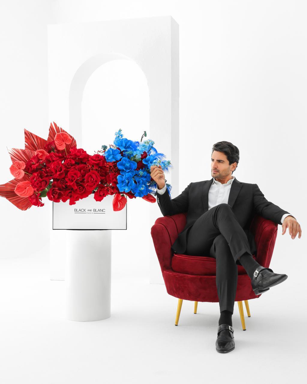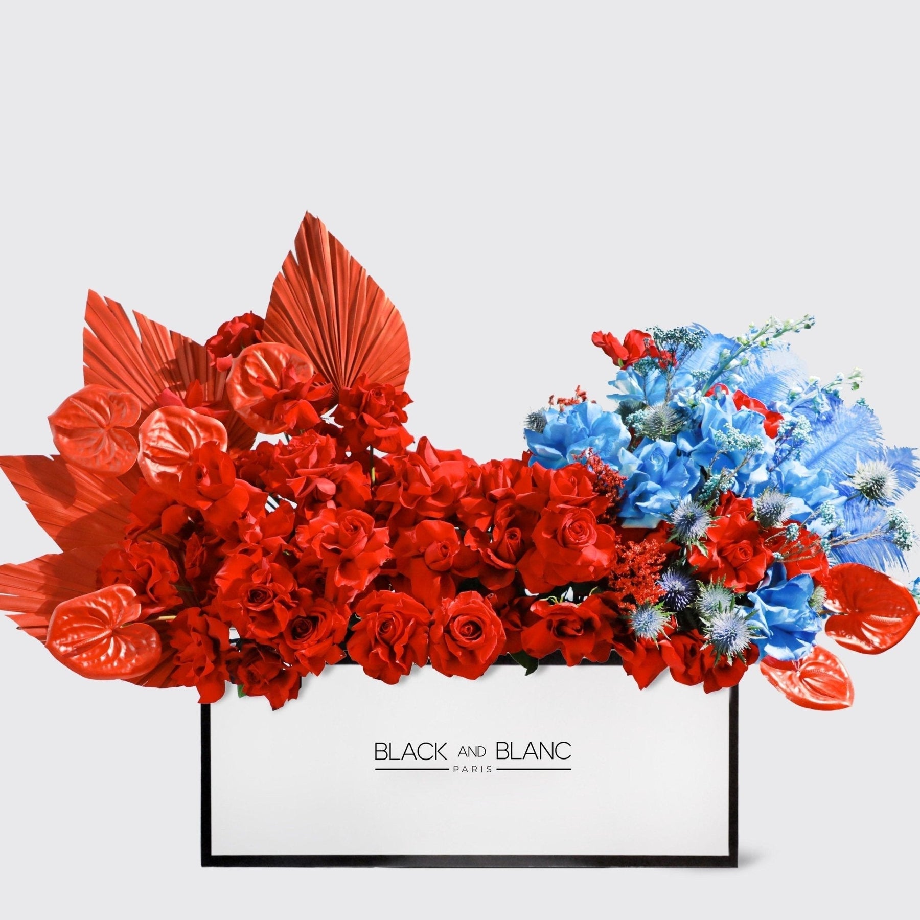 Housed in our signature BLACK AND BLANC box, Royal Flame is a bold fusion of rich red roses and deep blue florals, creating an unforgettable contrast. This vibrant composition reflects passion, confidence, and sophistication, making it the ultimate statement piece for any special moment.