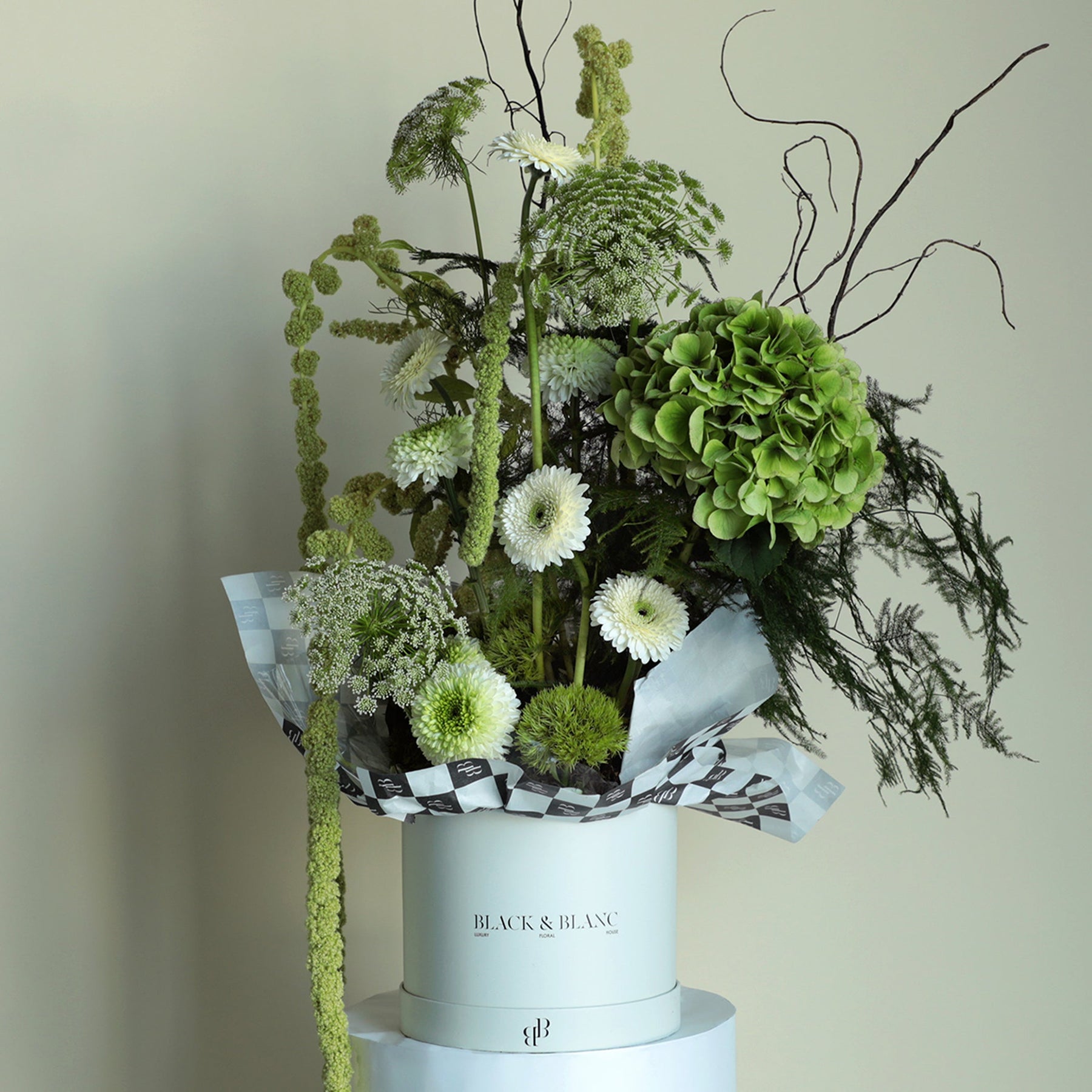 hydrangea, white gerberas, amaranthus, asparagus fern, and curly willow, arranged in soft, flowing movement.Serene, dreamy, and quietlyenchanting.