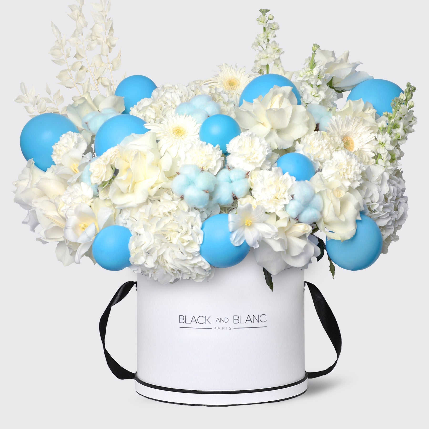 Blue Sky is a breathtaking arrangement featuring premium white hydrangea, elegant white roses, gerberas, matthiola, carnations, spray roses, tulips, and dried flowers, beautifully complemented with balloons, creating a luxurious display of pure elegance and charm—perfect for celebrating special occasions with timeless sophistication and unforgettable beauty.