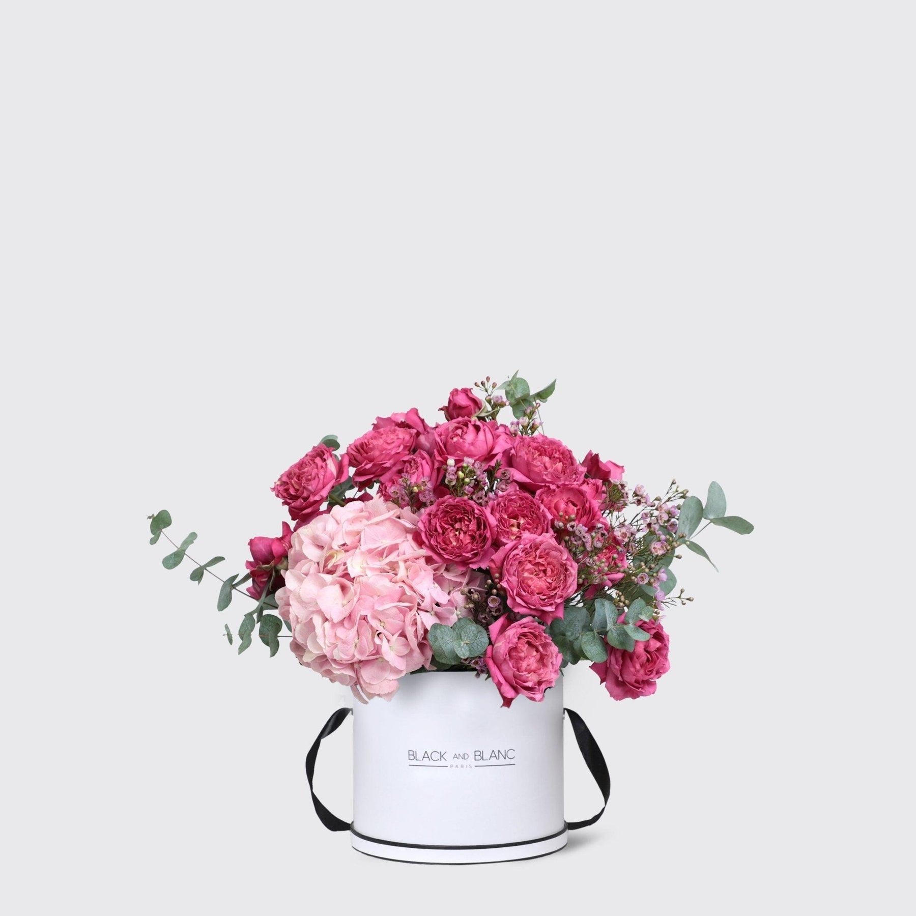 Embrace elegance with "Celine," a chic arrangement of spray roses, pink hydrangeas, white wax flowers, and eucalyptus. This collection captures the essence of modern sophistication, designed to enhance any space with its beauty and grace.