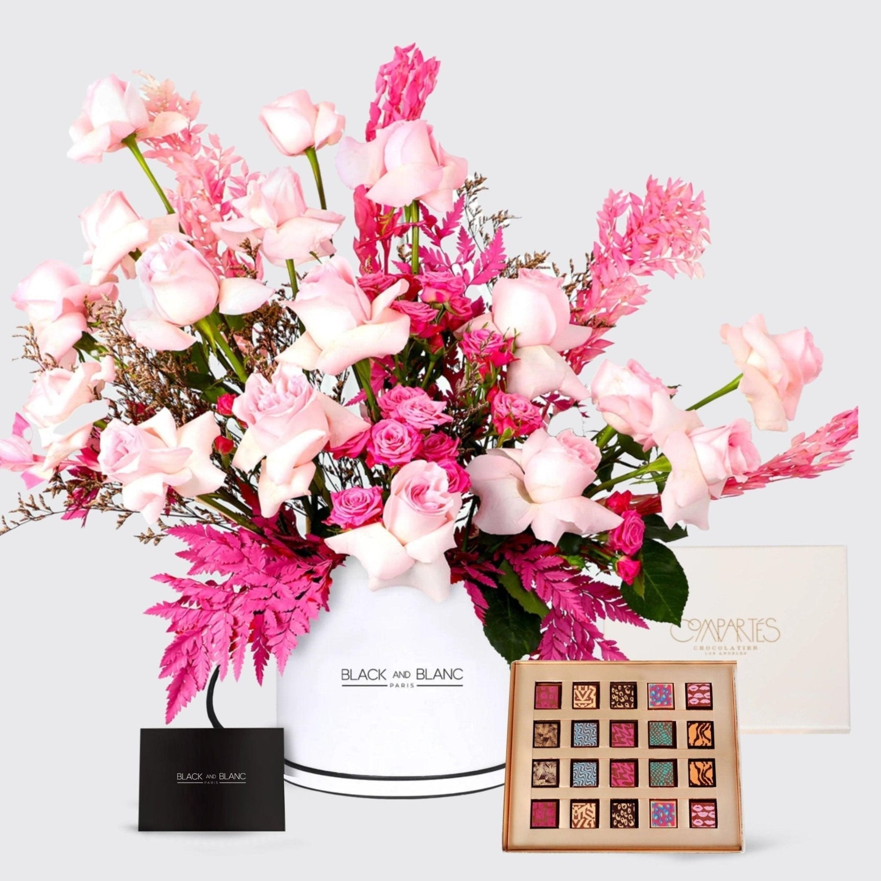 Step into a world of whimsy with our "Unicorn in Box," where pink roses and spray roses meet the ethereal beauty of leather fern, dried ruscus, and dried Limonium. This enchanting arrangement captures the magic of fairytales, perfect for gifting or adding a touch of fantasy to your decor with Compartes Chocolate 20Pcs.