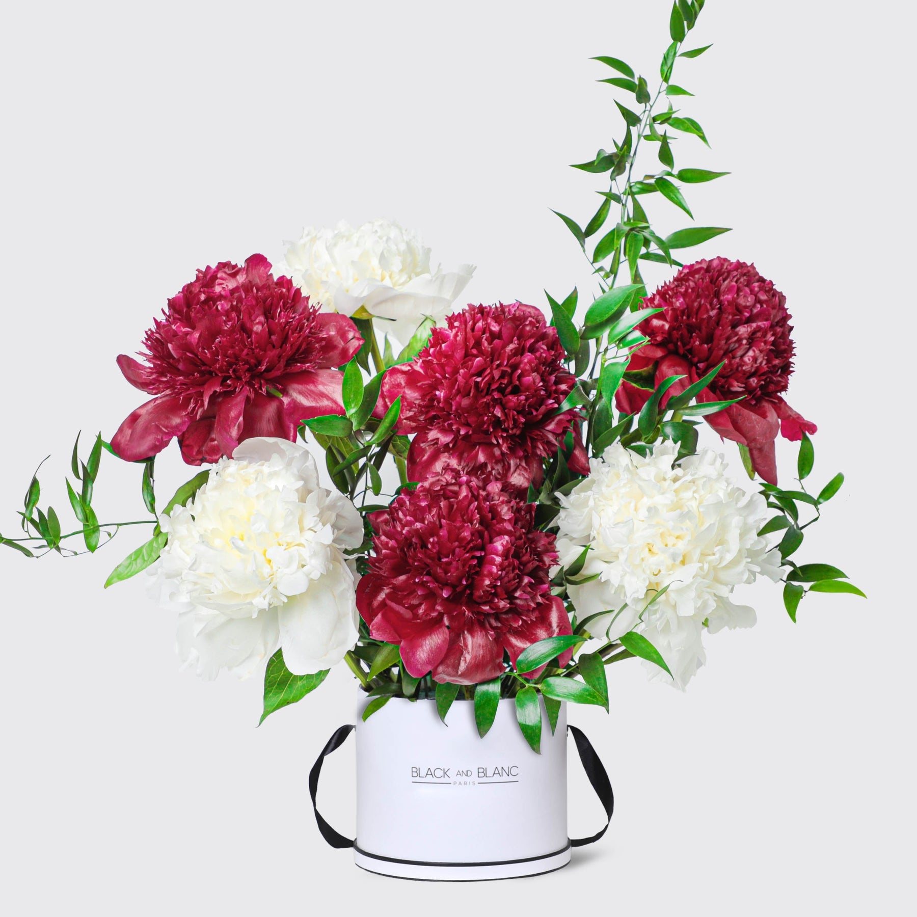 Introducing the elegant Crimson Ivory Peonies in Box, featuring vibrant Red Pink and delicate Peony White blooms accompanied by lush Greenery. Perfect for adding a touch of luxury and beauty to any occasion.