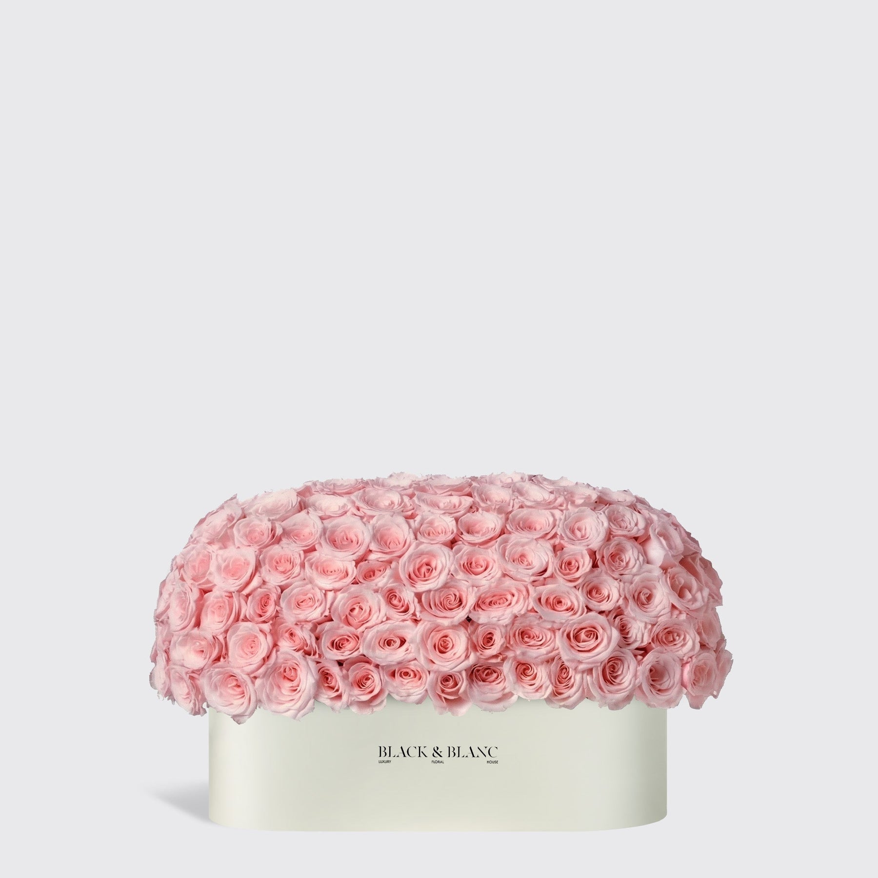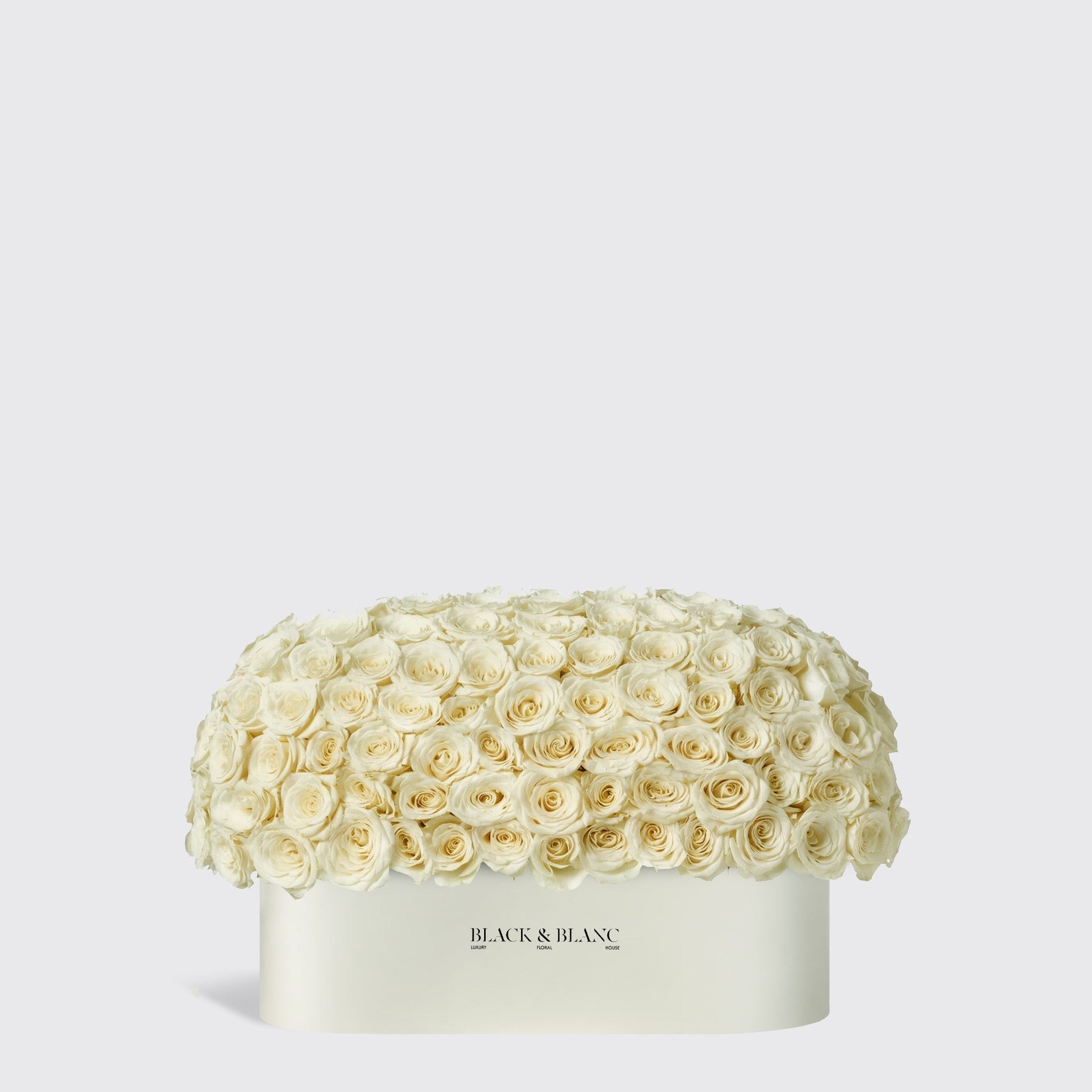 Dome in Half Meter Box is presented in our signature BLACK AND BLANC half meter box, where perfect symmetry and rich crimson blooms form a powerful visual statement. This arrangement is designed to captivate, embodying elegance, confidence, and timeless romance in its most striking form.