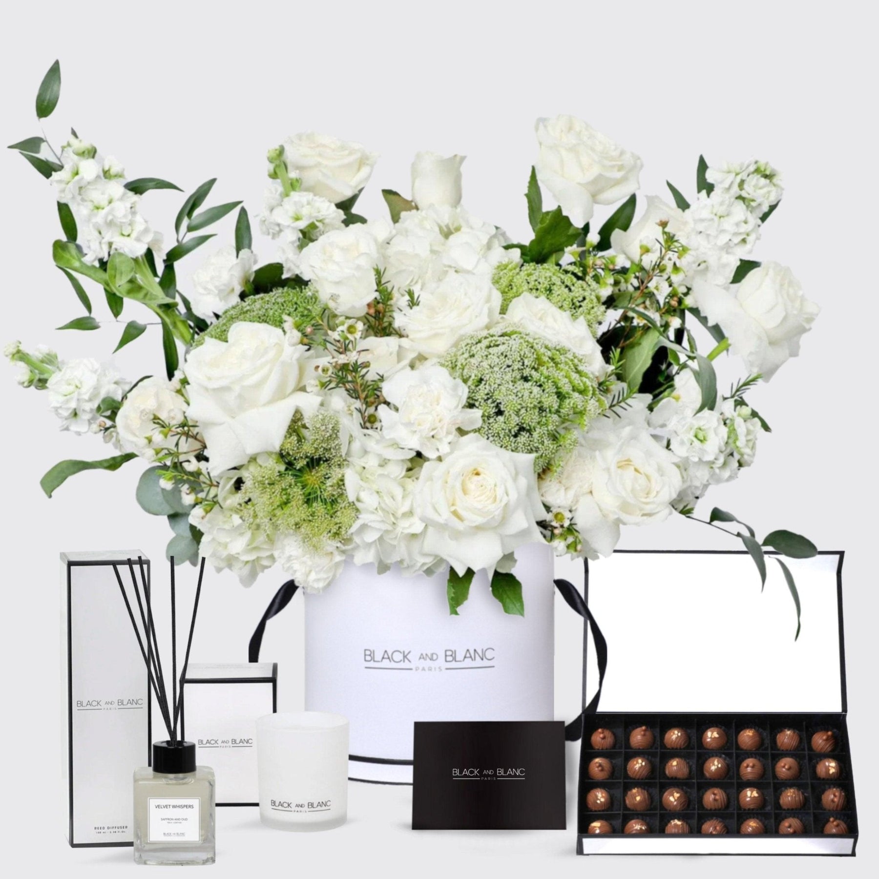 Step into a "Jardin Blanc," where white roses, hydrangeas, carnations, mattiolas, wax flowers, trachelium, and fresh Italian Ruscus come together in harmony. This lush box arrangement offers a breath of elegance and freshness, perfect for any occasion that demands a touch of sophistication with Diffuser, Scented Candle and 28Pcs Chocolate Truffles.