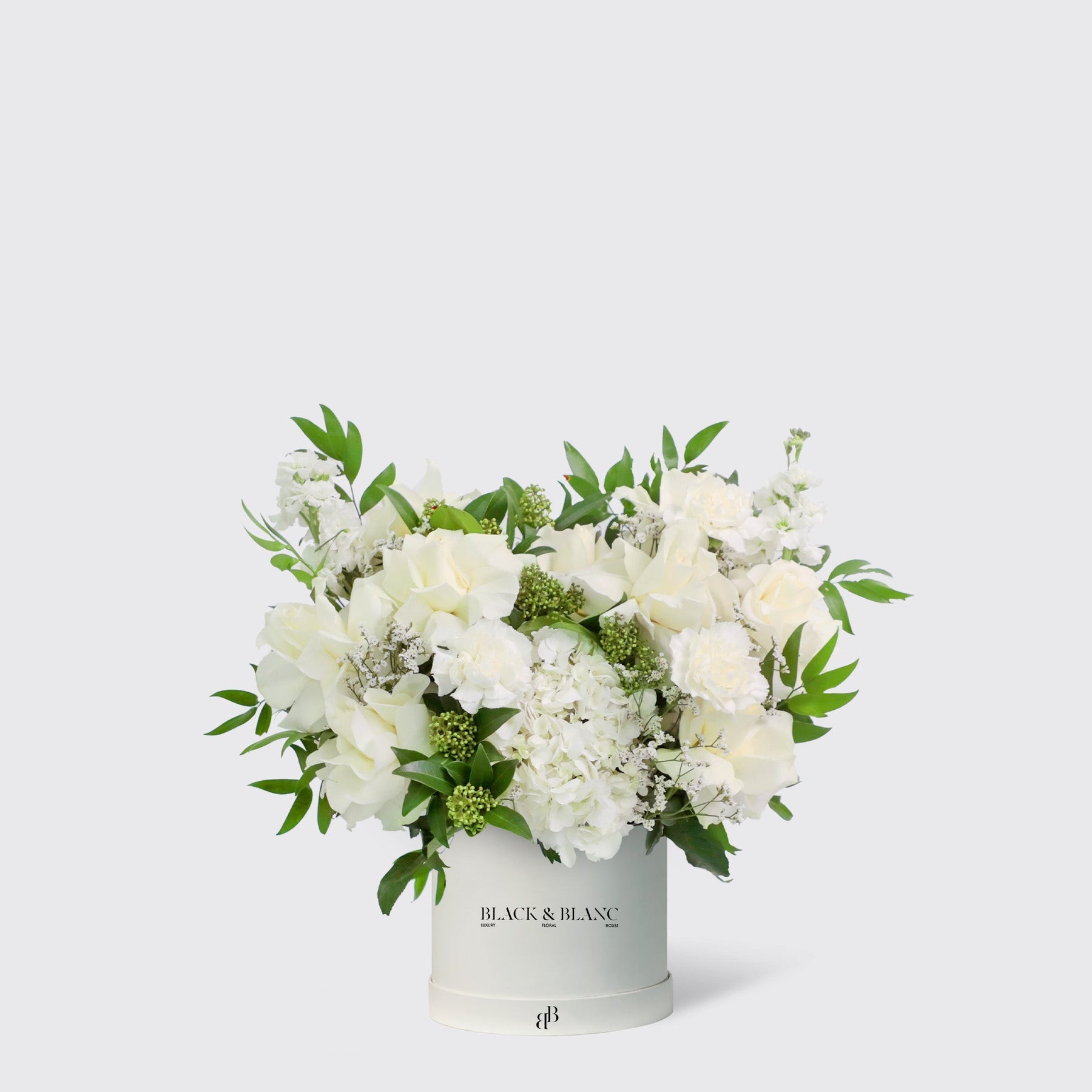 Jardin Blanc in a Box is a breathtaking arrangement of Hydrangea White, White Roses, Delphinium, Matthiola White, Limonium, Skimmia, and Italian Ruscus, creating a timeless and elegant floral masterpiece for any occasion.