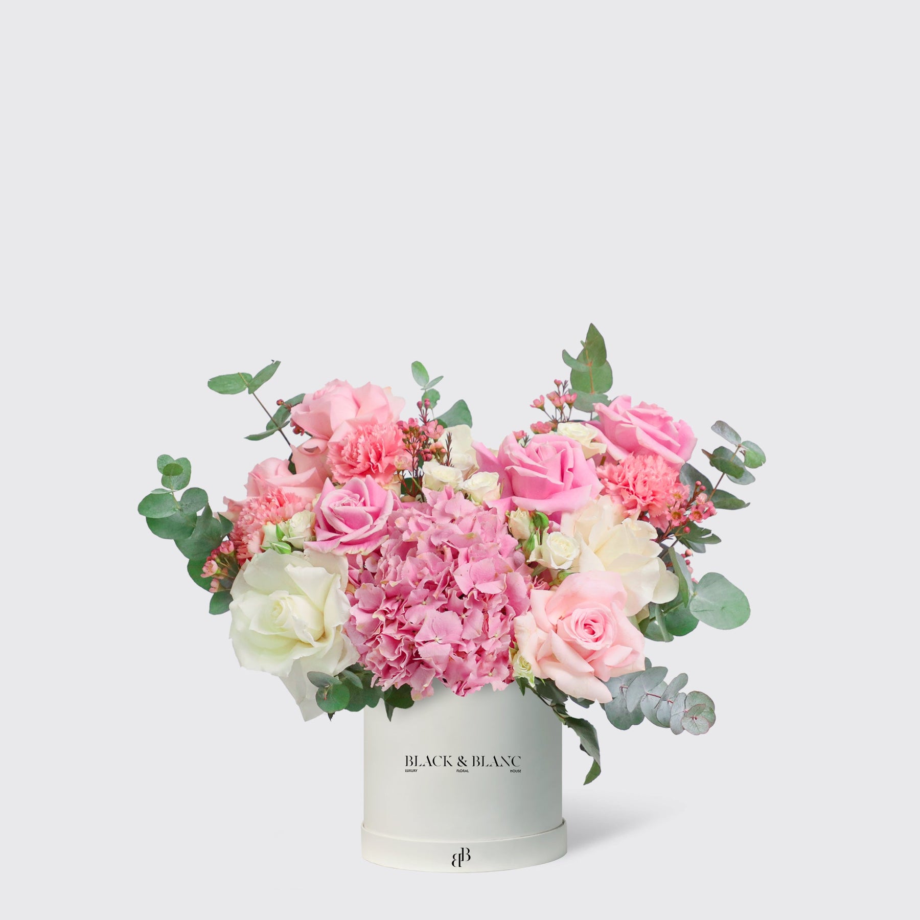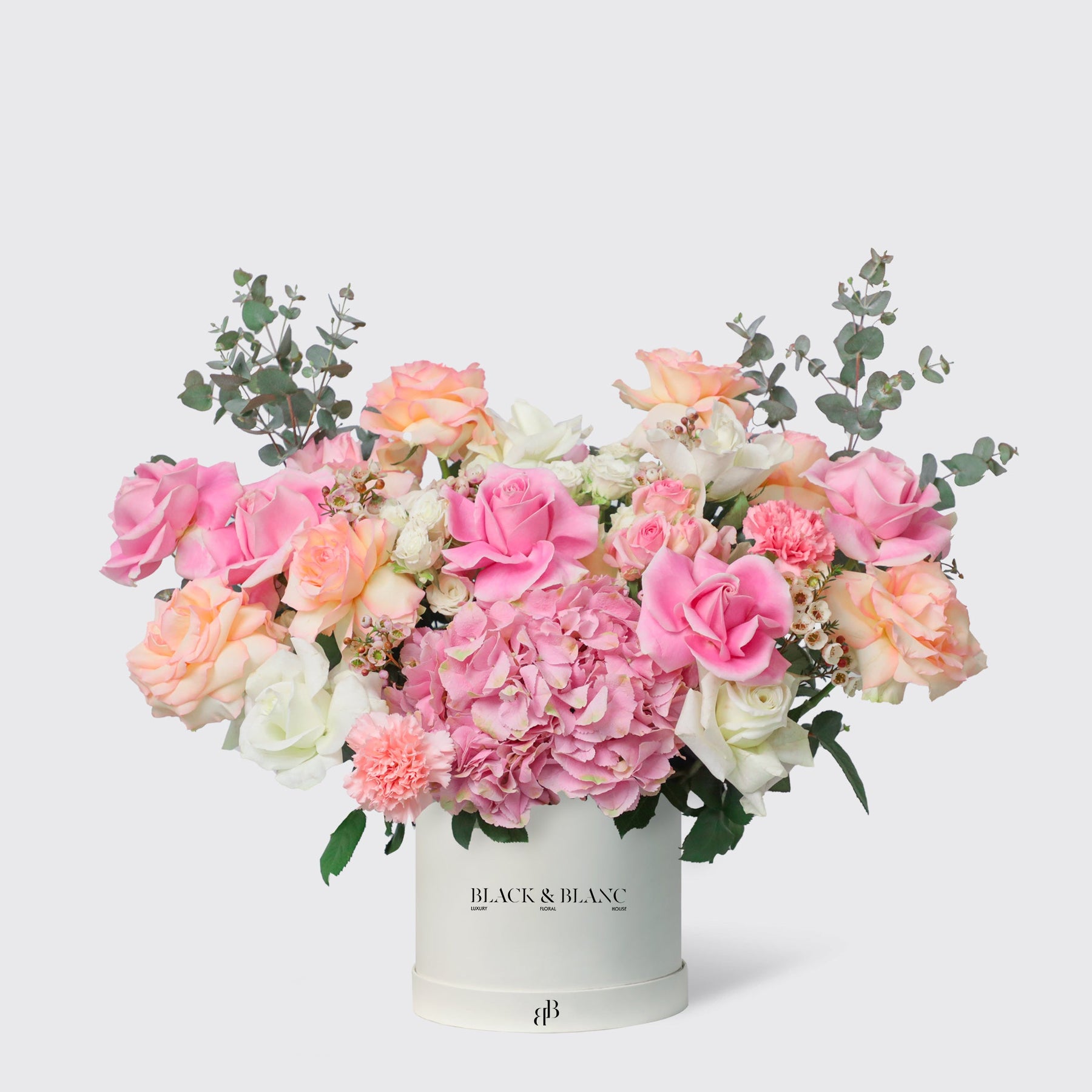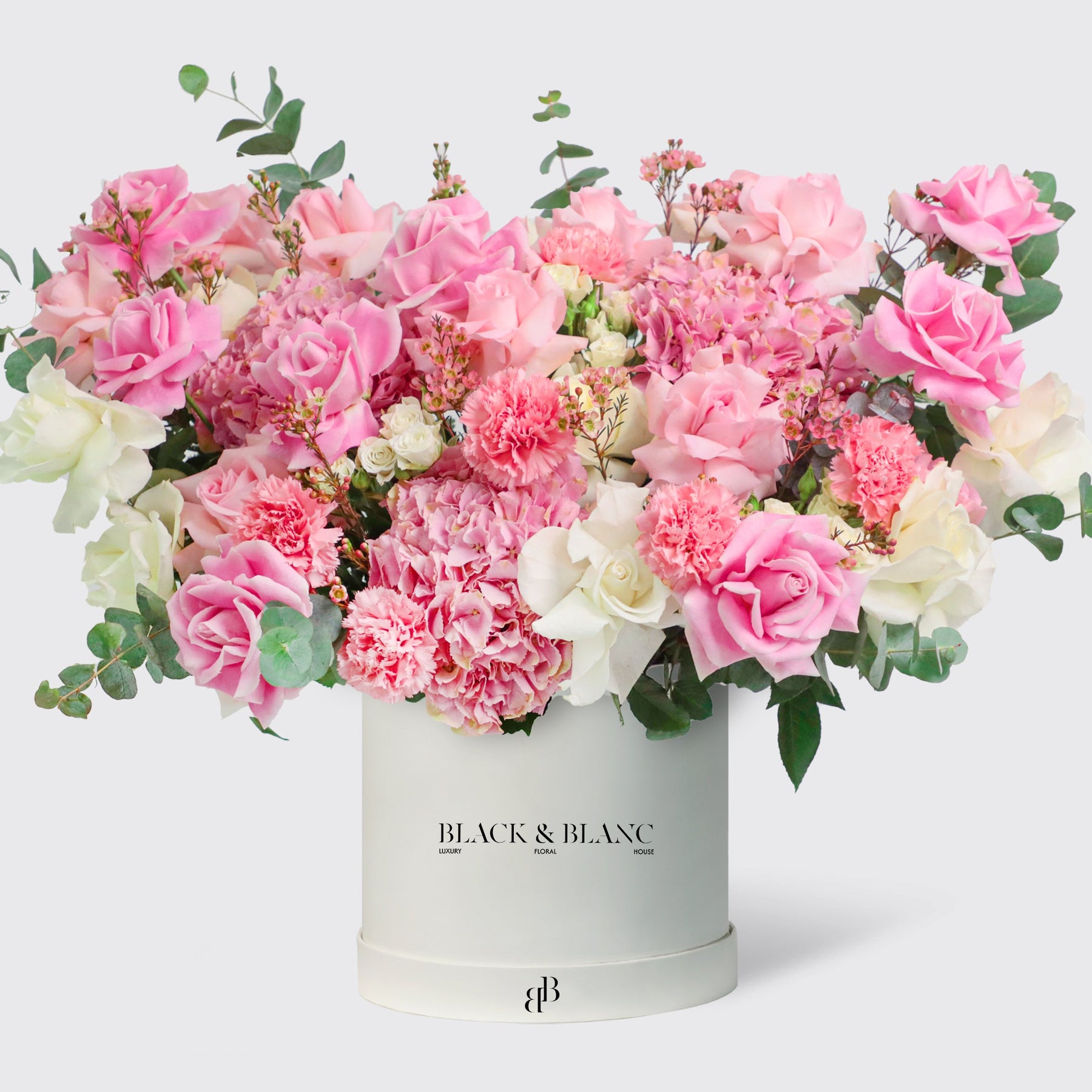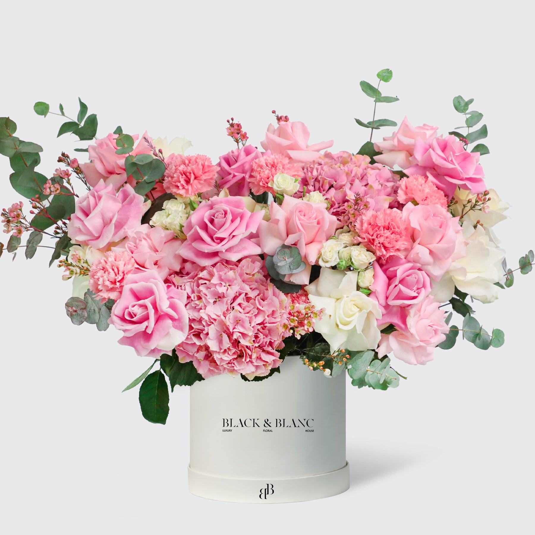 Pink Paradise in a Box is a stunning arrangement featuring Hydrangea Pink, Pink Esperance, Rosita Vendella, White Roses, Spray Roses, Wax Flower, and Eucalyptus, creating an elegant and charming floral display for any occasion.