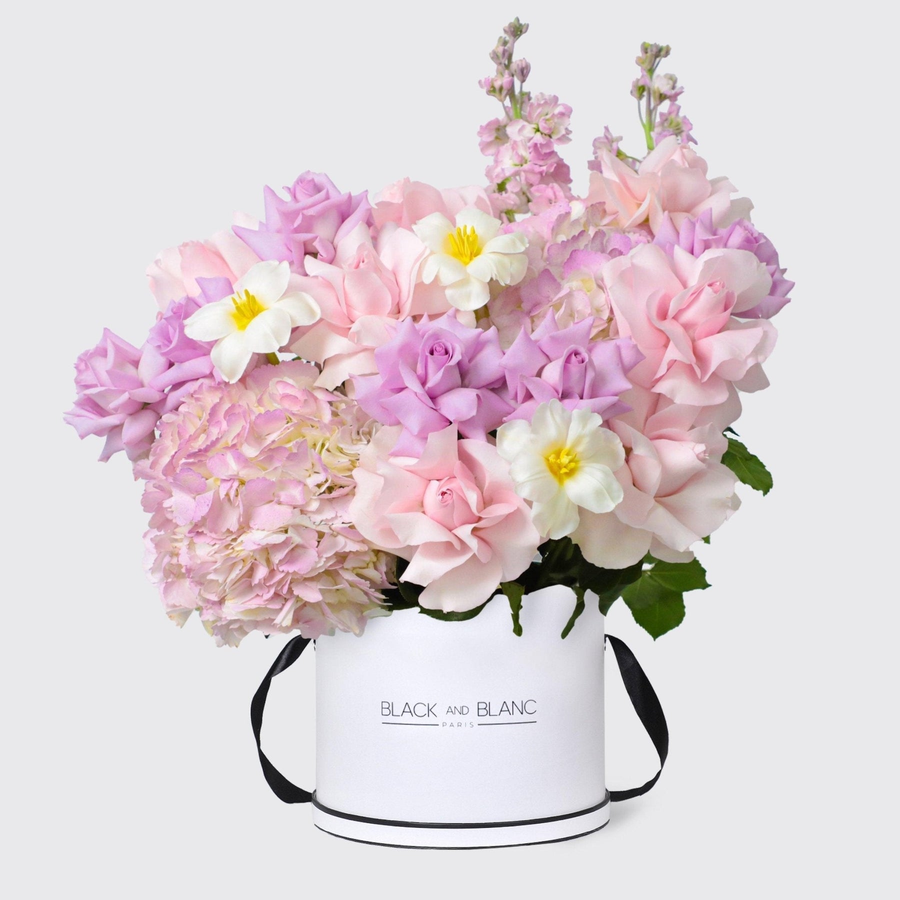 Purple Paradise in a Box features a stunning mix of Matthiola, Light Purple Roses, White Tulips, Pink Hydrangea, and Pink Roses, creating a vibrant and elegant floral arrangement perfect for any occasion.