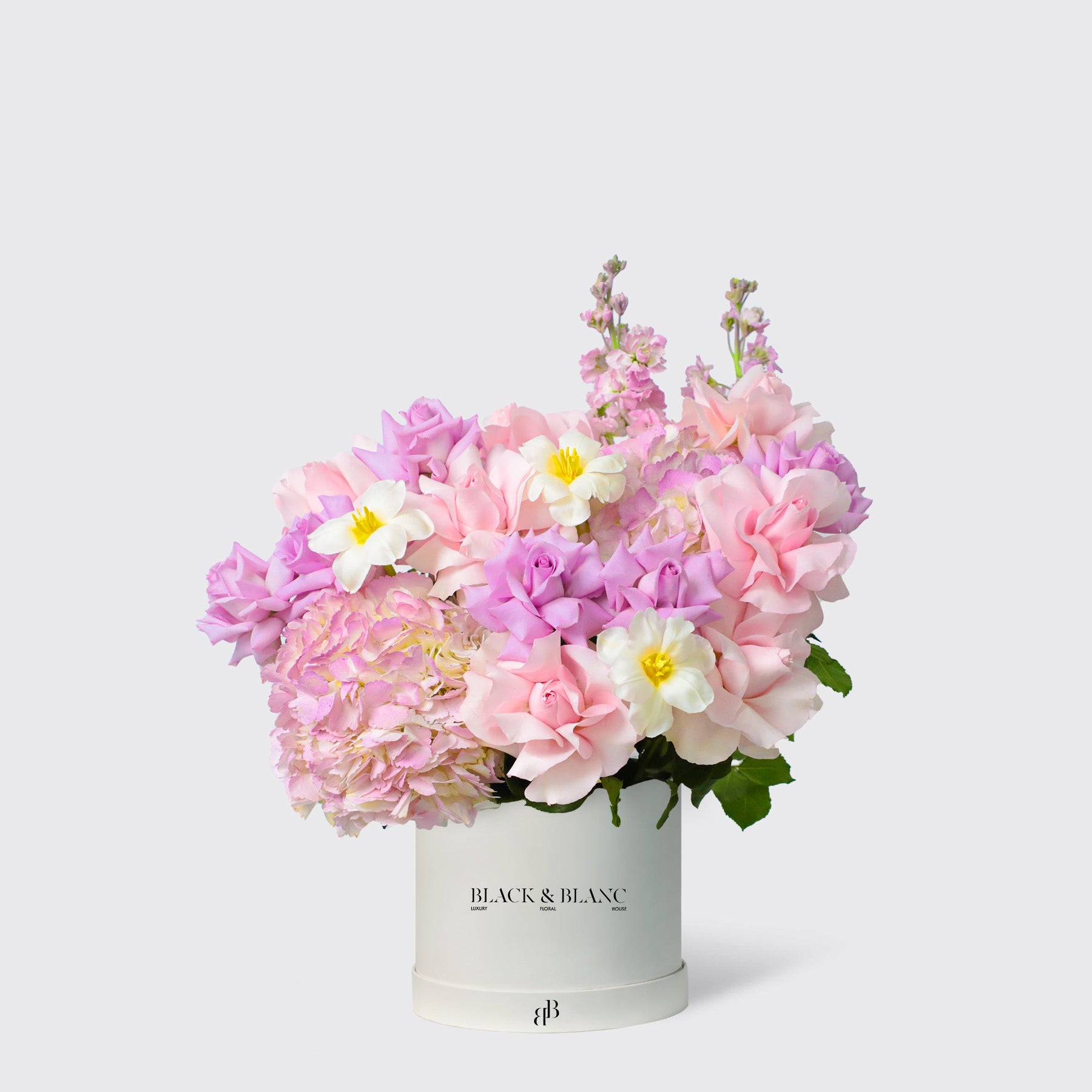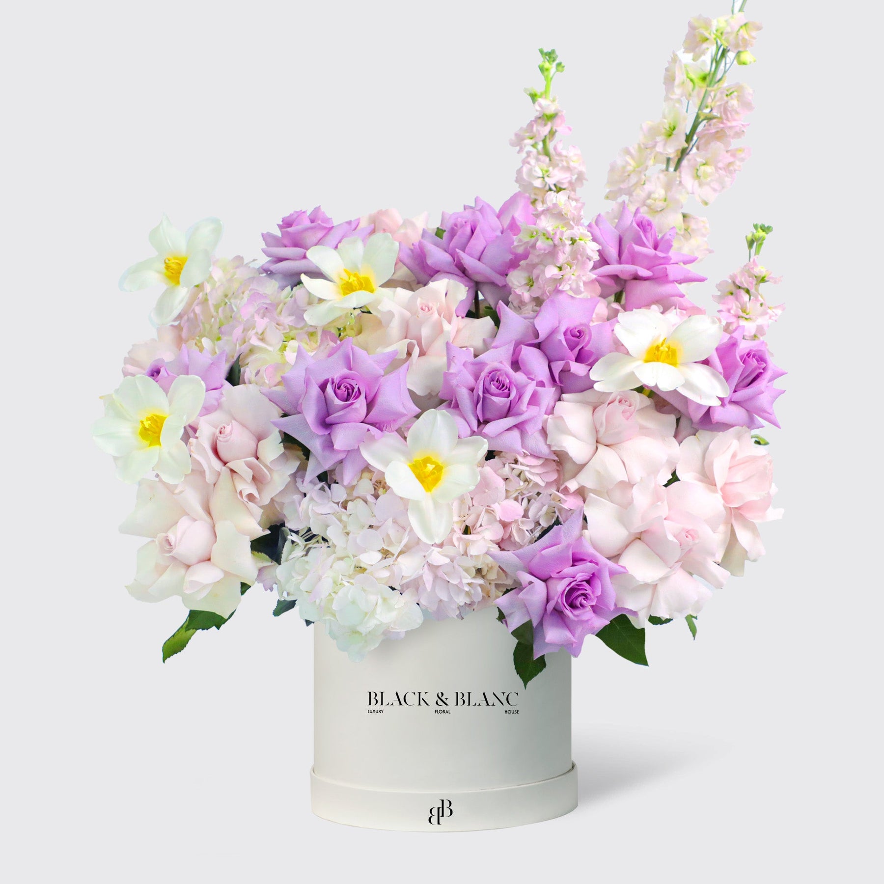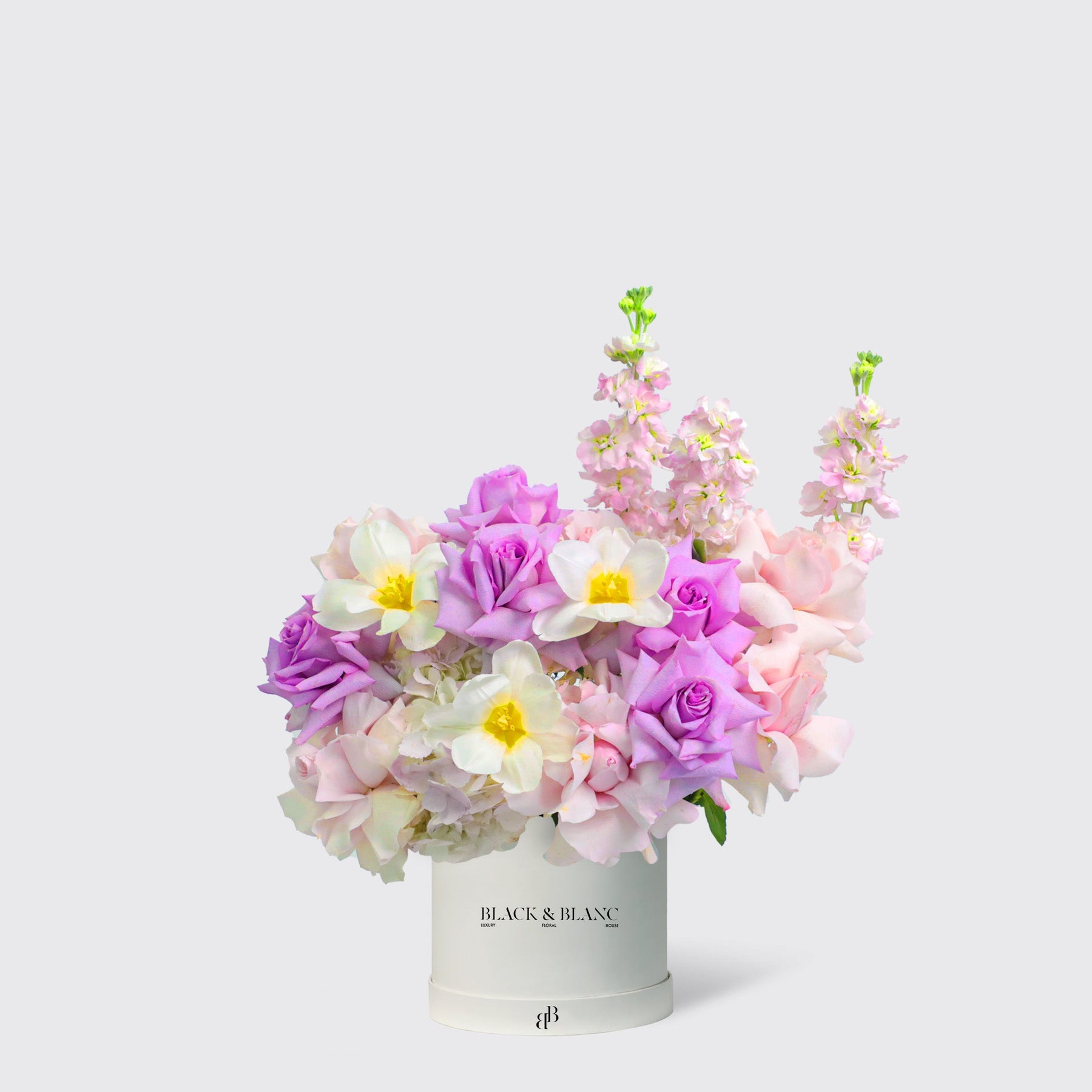 Purple Paradise in a Box features a stunning mix of Matthiola, Light Purple Roses, White Tulips, Pink Hydrangea, and Pink Roses, creating a vibrant and elegant floral arrangement perfect for any occasion.