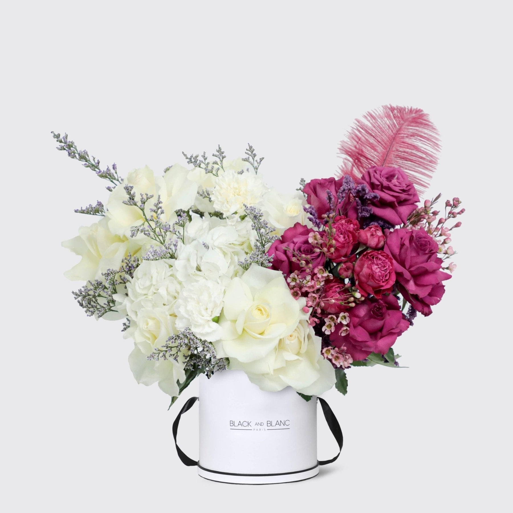 Experience elegance with the Rouge Eclat in Box, featuring a stunning mix of white hydrangeas, white roses, white carnations, purple limonium, blue berry roses, Juliet spray, wax flowers, dried limonium, and delicate feathers.