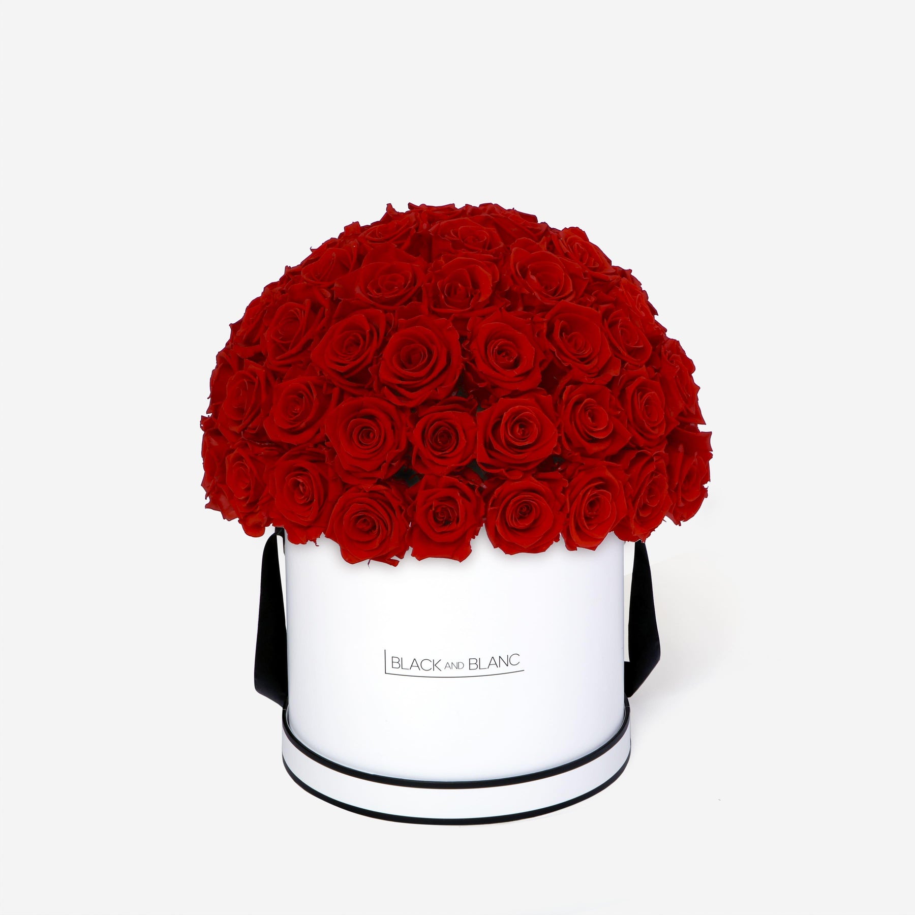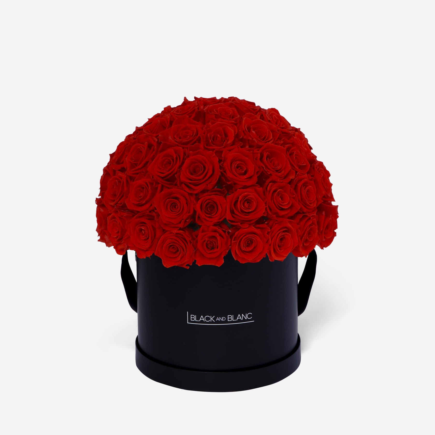 Infinity Dôme Classic - is a beautiful arrangement from the Infinity Collection of BLACK AND BLANC. All the arrangements in this collection can live up to 3 years if taken care of properly. Flowers in this arrangement are sourced from the farms of BLACK AND BLANC in South America and Netherland. This Beautiful arrangement consists of Infinity Roses.